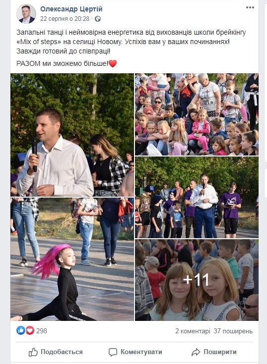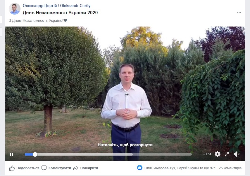 Від міського голови не відставали депутати міськради обласного центру. Відеопривітання записав депутат Олександр Цертій (ВО «Батьківщина»). На це відео замовили рекламу в Facebook, оплатив її розміщення політик.