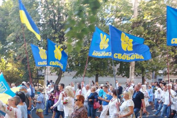 Під час традиційної ходи вишиванок у Кропивницькому несли державний прапор, червоно-чорний стяг та майоріли політичні прапори Всеукраїнського об’єднання «Свобода».