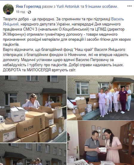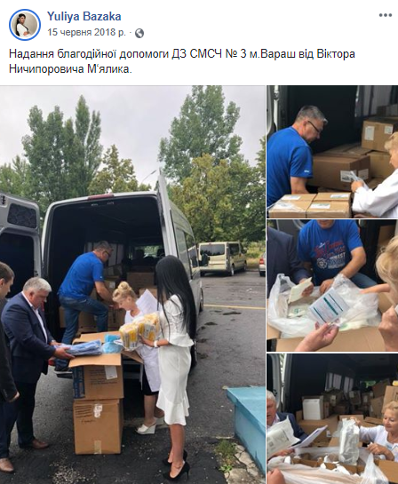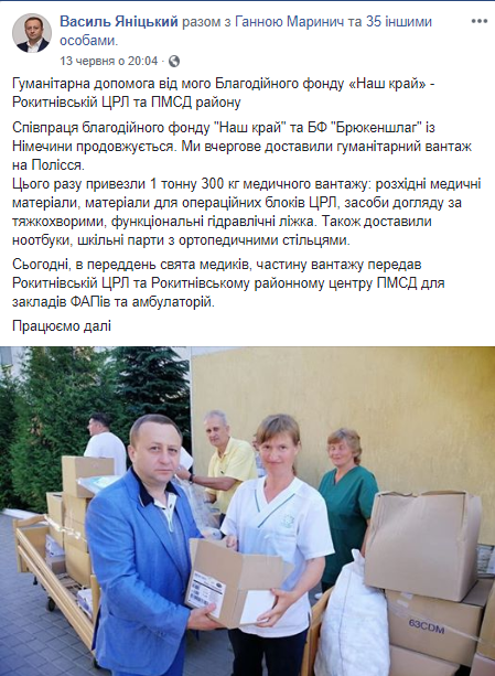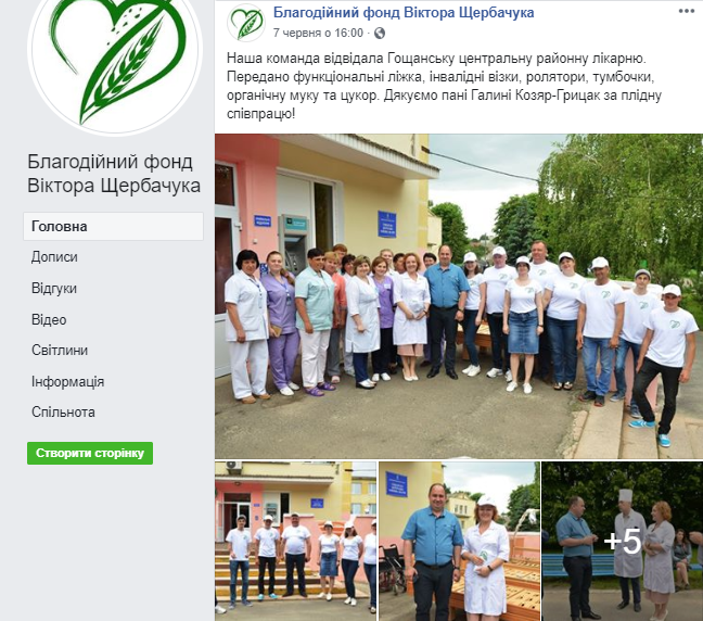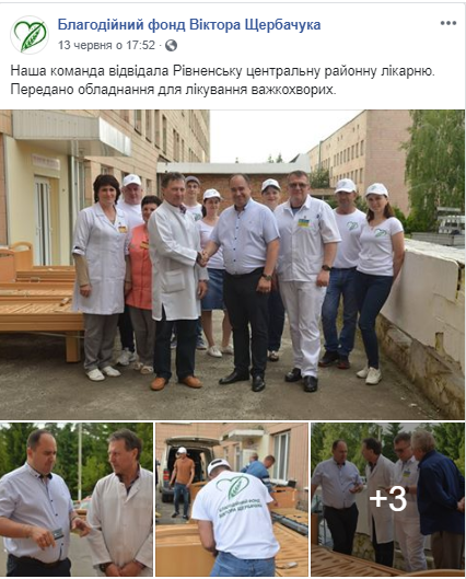 Низка публікацій у Facebook – сторінці стосується благодійності для медичних закладів: 12 червня для Рівненської центральної районної лікарні «передано обладнання для лікування важкохворих» та 7 червня – для Гощанської центральної районної лікарні «передано функціональні ліжка, інвалідні візки, ролятори, тумбочки, органічну муку та цукор»/