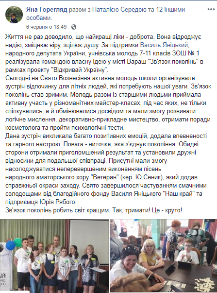 6 червня «за підтримки Василя Яніцького, народного депутата України, учнівська молодь 7-11 класів ЗОШ № 1 реалізувала командою власну ідею у місті Вараш «Зв'язок поколінь» в рамках проекту «Відкривай Україну». … Свято завершилося частуванням смачними солодощами від благодійного фонду Василя Яніцького «Наш край», - опубліковано на Facebook-сторінці депутата.