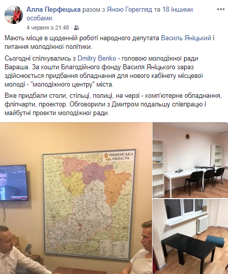 4 червня - за кошти благодійного фонду придбано обладнання для нового кабінету місцевої молоді – «молодіжного центру» міста Вараш. Вже придбано столи, стільці, полиці; на черзі - комп'ютерне обладнання, фліпчарти, проектор.