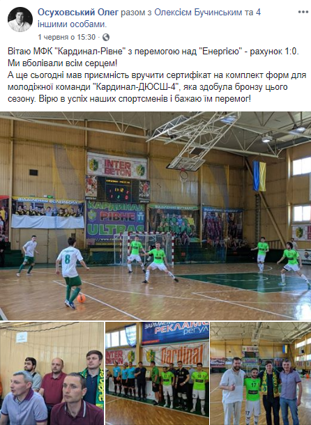 1 червня на власній сторінці у Facebook народний депутат зазначив, що вручив сертифікат на комплект форм для молодіжної команди «Кардинал-ДЮСШ-4».