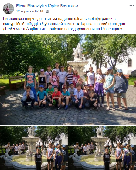 12 червня опубліковано слова подяки на сторінці у соціальній мережі Facebok Юрія Вознюка за надання фінансової підтримки в екскурсійній поїздці до Дубенського замку й Тараканівського форту для дітей з міста Авдіївка, які приїхали на оздоровлення на Рівненщину.