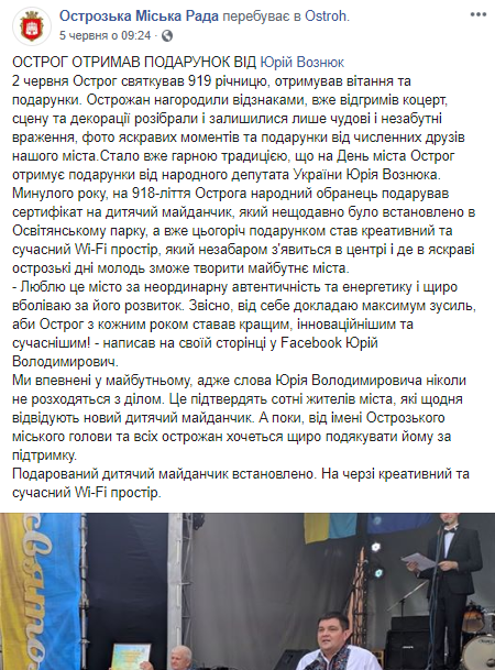 2 червня на День міста Острога народний депутат подарував креативний та сучасний Wi-Fi простір, який незабаром з'явиться в центрі міста. Про це на свої сторінці у Facebook написала Острозька міська ради. Також у повідомлення висловлюється подяка Юрію Вознюку за підтримку.