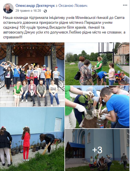 29 травня на Facebook-сторінці народний депутат повідомив, що «команда підтримала ініціативу учнів Млинівськоі гімназії до Свята останнього дзвоника прикрасити рідне містечко. Передали учням саджанці 100 кущів троянд».