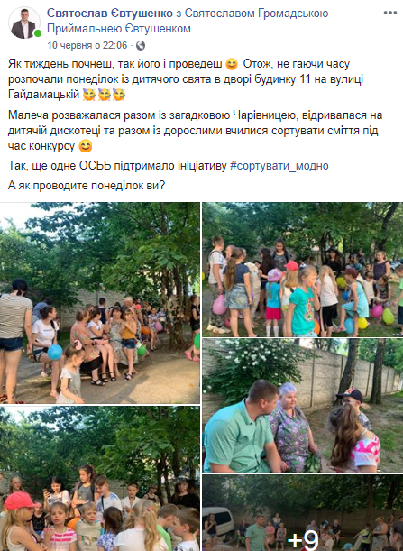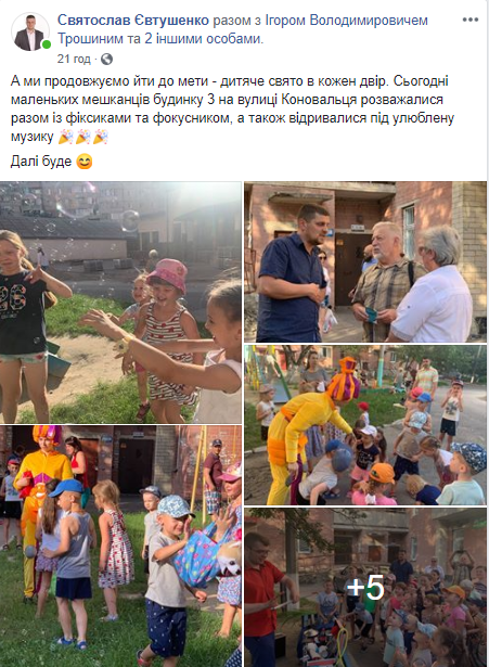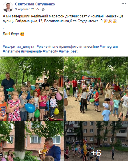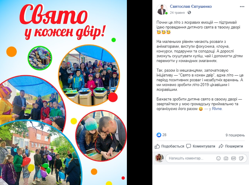 Ініціатива «Свято у кожен двір» - дитяче свято за участі аніматорів, фокусників та клоунів, а також солодких подарунків, організоване Святославом Євтушенком. Такі дитячі свята відбулися у понад 20 дворах Рівного: 14 червня (вул. Коновальця, 5), 10 червня (вул. Гайдамацька, 11), 9 червня (вул. Гайдамацька, 13, вул. Богоявленська, 6 та вул. Студентська, 9), 8 червня (вул. Соборна БОС 69, 287 і 291, вул. Дубенській БОС 330, вул. Відінська, 13 та 15), 7 червня (вул. Коновальця, 18 та вул. Ніла Хасевича, 27), 2 червня (вул. Київська, 17, вул. Крушельницької, 75 та вул. Драганчука, 4), 1 червня (вул. Вербова, 46, вул. Макарова, 26, вул. Кавказька, 15, вул. Чорновола, 40, 91, 91а) та 26 травня (вул. Буковинська, 16, 16а, вул. Соборна, 257).
