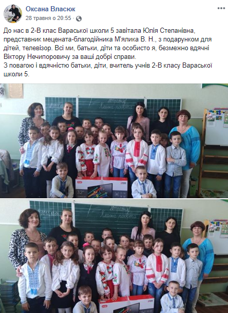 5 червня з нагоди Дня захисту дітей для вихованців Блажівського дитячого навчального закладу «Калинка» Рокитнівського району Рівненської області подарував телевізор. Також 28 травня представниця Віктора М’ялика подарувала телевізор для учнів 2-В класу Вараської загальноосвітньої школи №5. І 25 травня для Глиннівської загальноосвітньої школи Рокитнівського району від імені Віктора М’ялика подарували багатофункціональний пристрій (кольоровий принтер 3 в 1).
