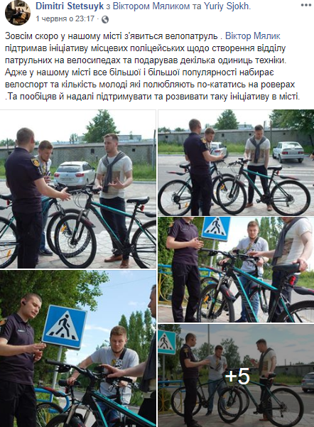 1 червня Віктор М’ялик подарував «декілька одиниць техніки» [велосипедів], підтримавши ініціативу місцевих поліцейських щодо створення відділу патрульних на велосипедах.