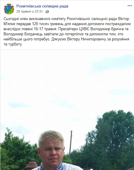 29 травня на сторінці у соціальній мережі Facebook Рокитнівської селищної ради повідомили, що Віктор М’ялик передав 120 тисяч гривень для надання допомоги постраждалим внаслідок повені 16-17 травня та висловили слова вдячності.