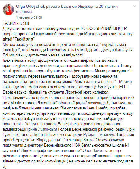5 червня до Міжнародного дня захисту дітей під час інклюзивного фестивалю «Такий як я» Олександр Данильчук «оплатив всі наші меблі, придбав комп'ютерну техніку, принтер, телевізор та кондиціонери преміум класу, а також організував незабутнє свято весни для наших найкращих волонтерів».