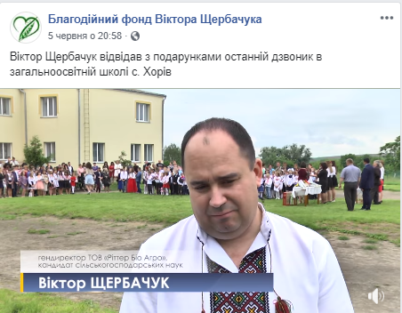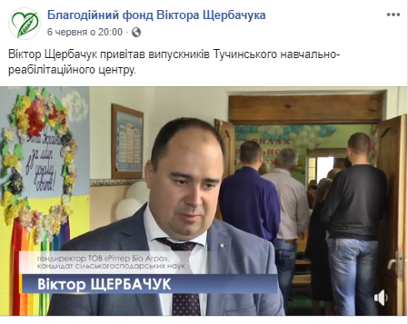 6 червня з’явилось повідомлення про привітання випускників Тучинського навчально-реабілітаційного центру Гощанського району Рівненської області. «Приготували для випускників маленькі подаруночки. Наш органічний цукор, те що ми виростили. Плюс і цукерки, і блокноти, і ручки. Все, що потрібно для повсякденного життя», - каже Віктор Щербачук.
