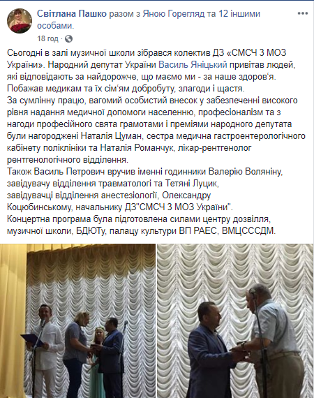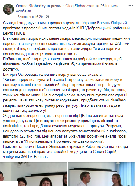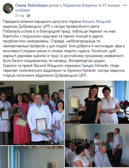 Крім цього, за дорученням народного депутата, його помічниця Оксана Слободзян привітала з професійним святом медиків Дубровицького районного центру первинної медичної допомоги. «Нещодавно отримали від нашого депутата гематологічний аналізатор, вартістю 320 тис. грн. Цей апарат за 3 хвилини робитиме аналіз крові пацієнта за 19 показниками. Про нього ми давно мріяли», - пише помічниця нардепа. Грамоти та премії Василя Яніцького отримали ще двоє медичних працівників.