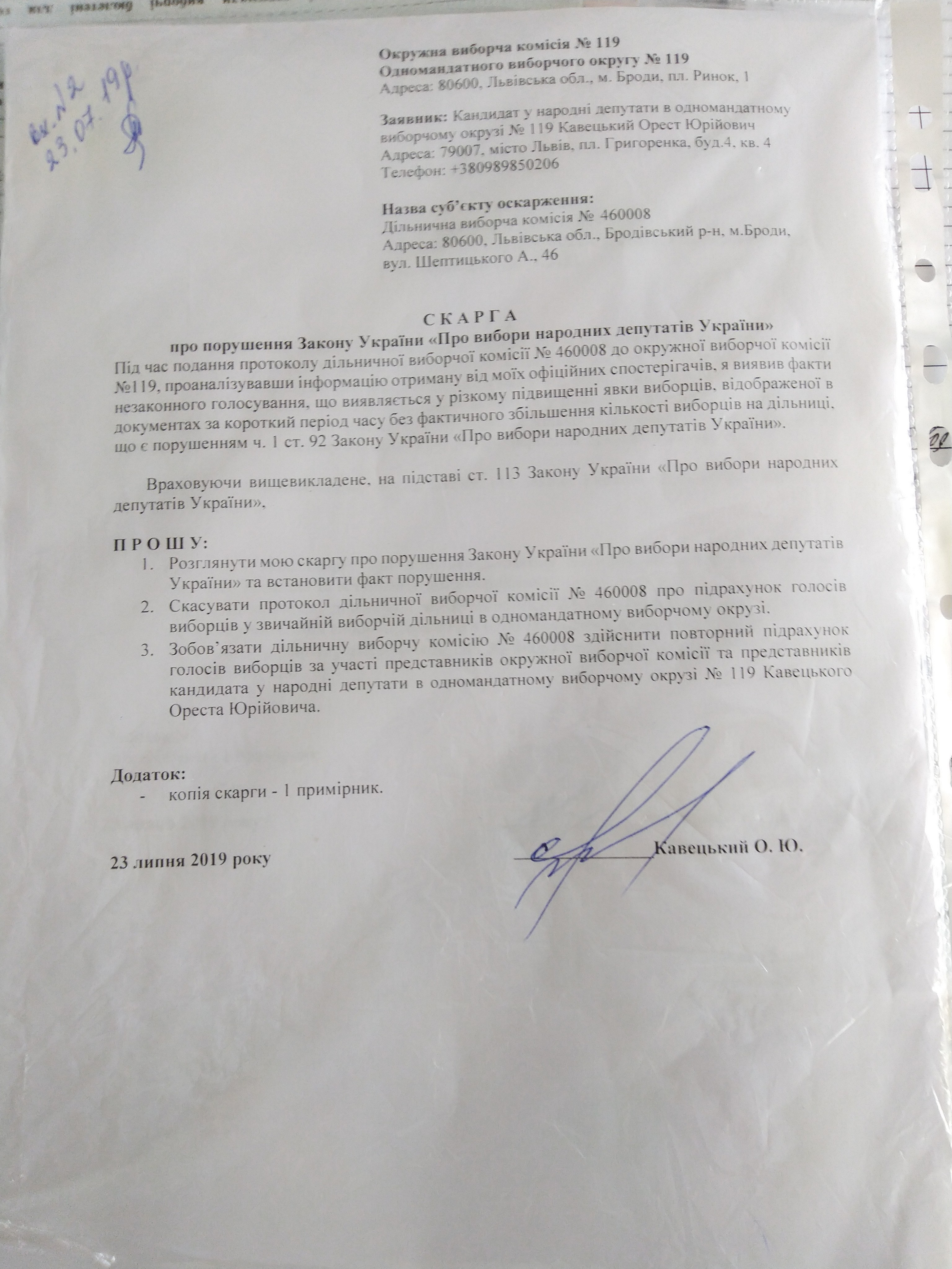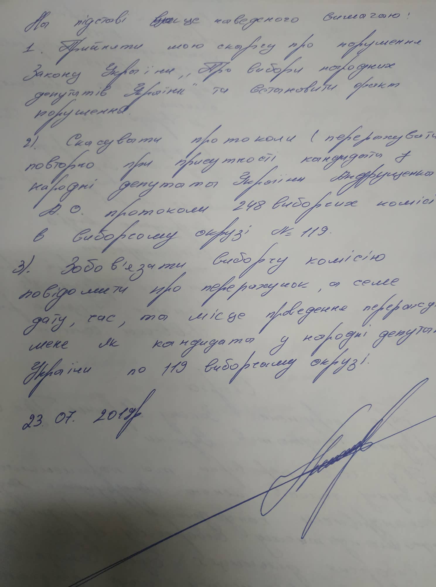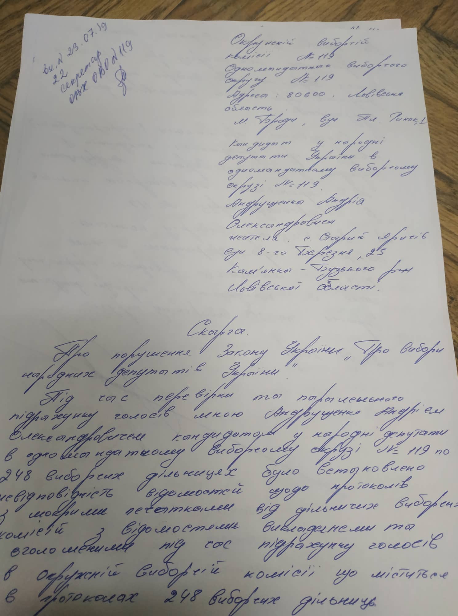 Зазначимо, що 22 липня також і політична партія «Слуга народу» опублікувала інформацію про оскарження результатів у різних округах, де зокрема і зазначено 119 виборчий округ на Львівщині.