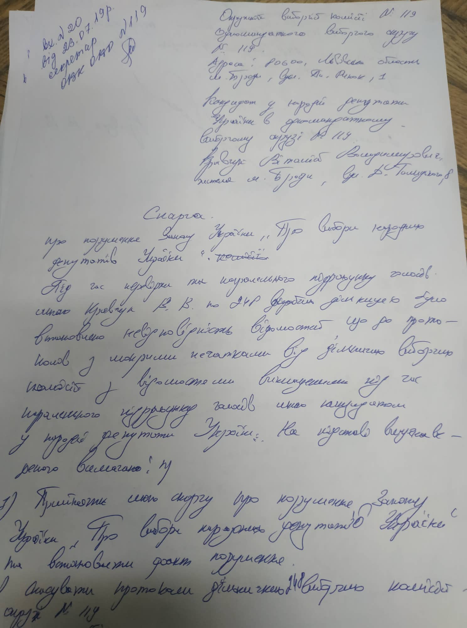 Окружна виборча комісія №119 продовжує працювати четвертий день і розглядати скарги кандидатів, які заявляють про розбіжність у цифрах, які є на сайті Центральної виборчої комісії та їхніми підрахунками. Низка кандидатів пропонує перерахувати голоси на усіх 248 дільницях, бо вважають, що була фальсифікація результатів. Наразі доказів надано не було.