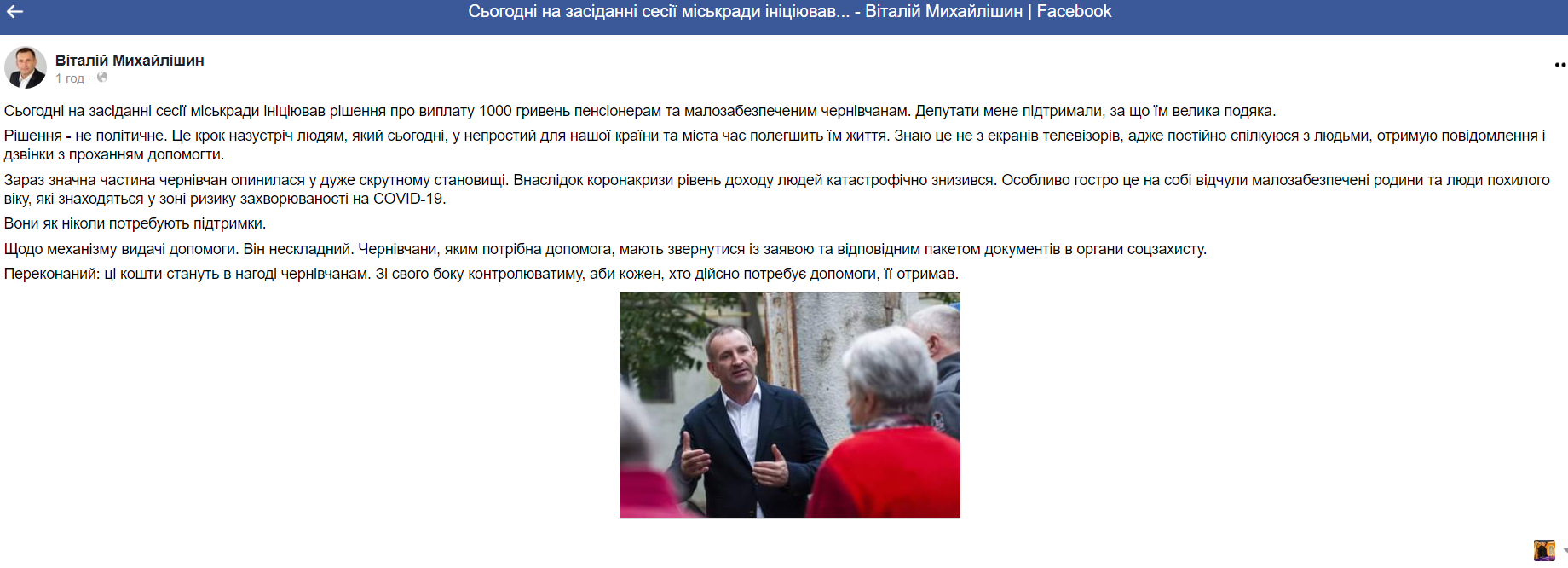 Щоб спростити порядок виплати коштів, Віталій Михайлішин під час сесії запропонував видавати кошти за заявою від малозабезпечених чернівчан. Це може свідчити про ймовірний піар за рахунок коштів бюджету міста.