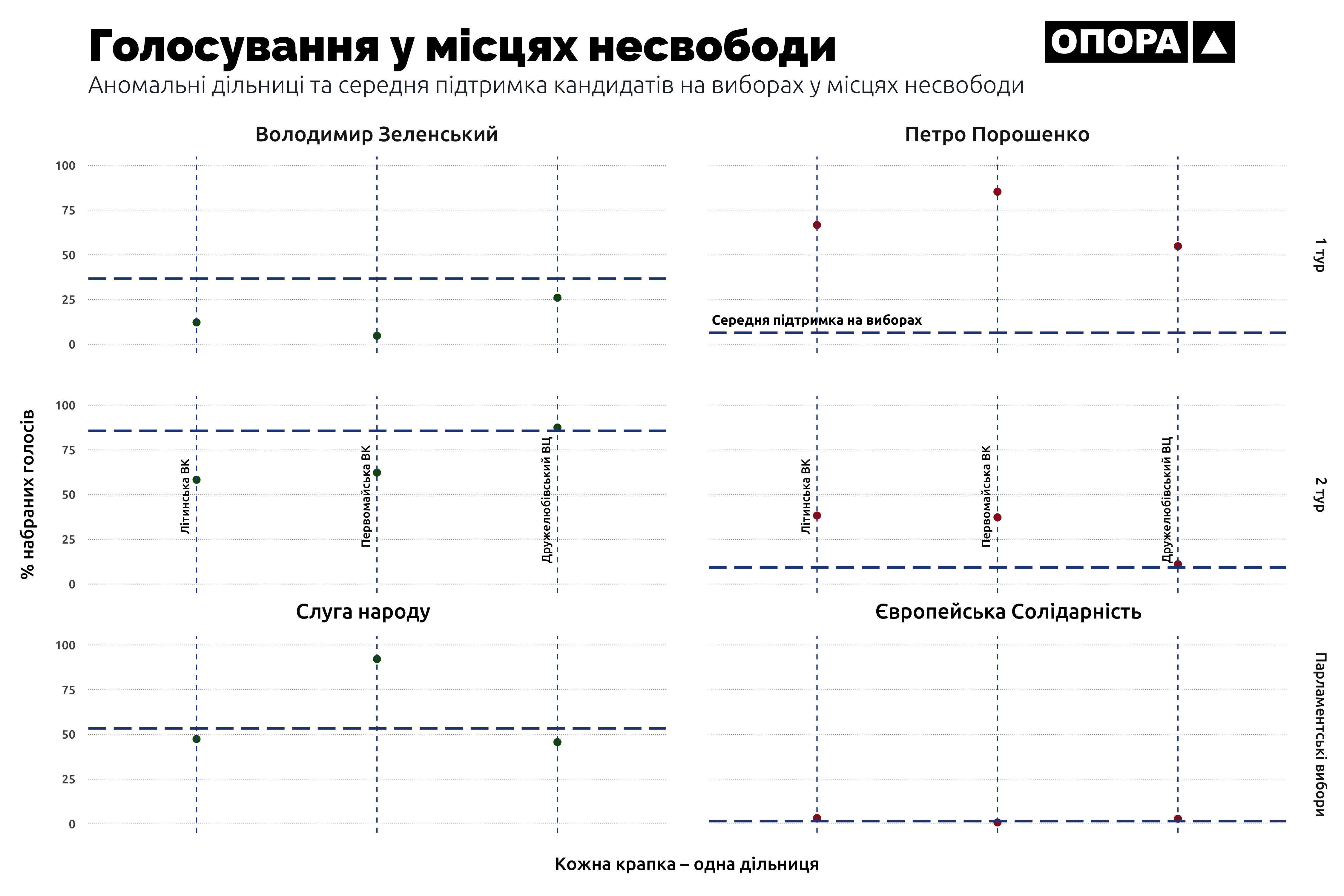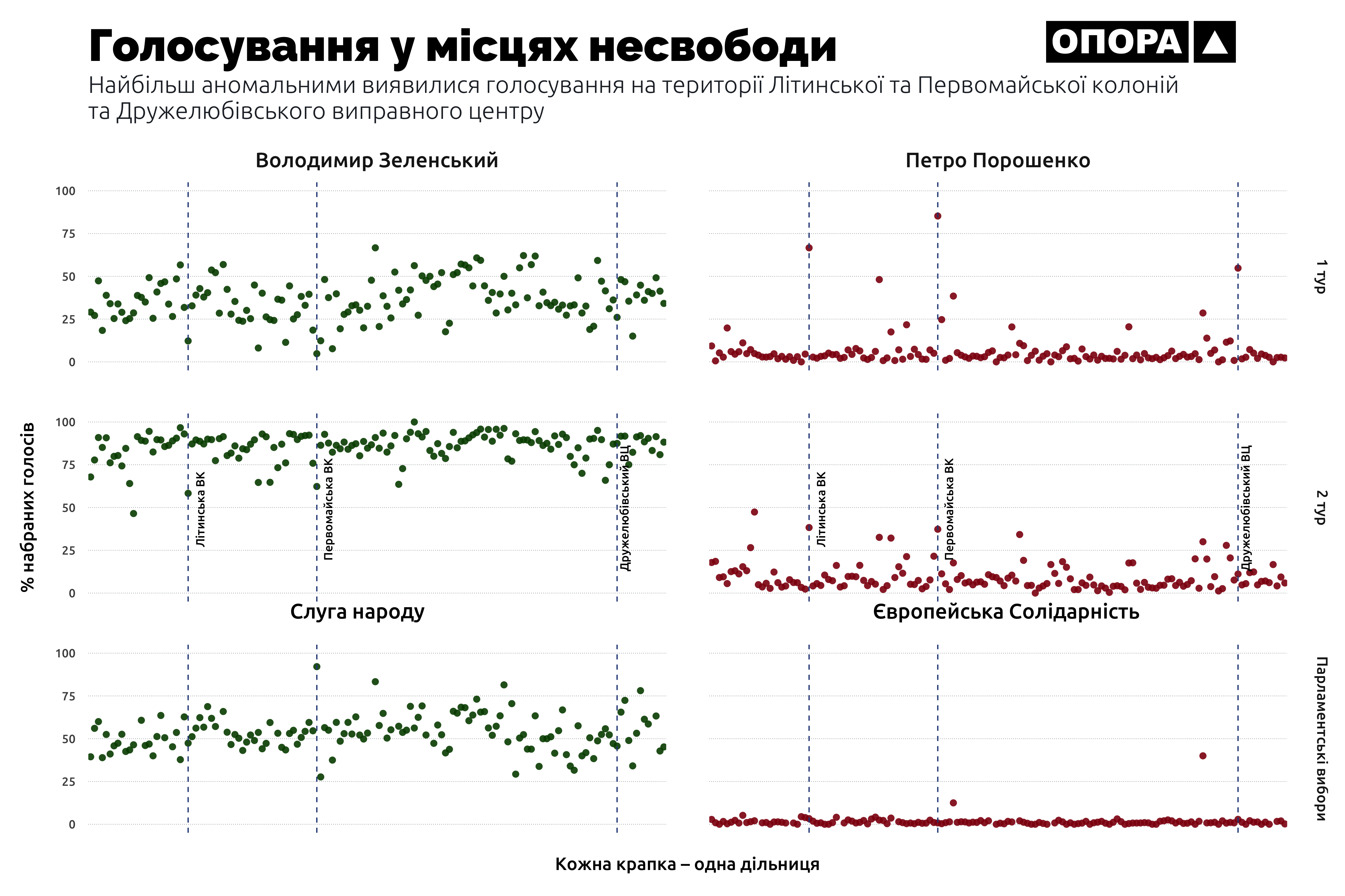 Увагу також привертає Літинська виправна колонія (Вінницька область) та Дружелюбівський виправний центр (№1), що у Запорізькій області. На першій з них чинний тоді Президент Петро Порошенко отримав 69% (158 голосів), на другій – 56% (40 голосів). Під час повторного голосування в Літинській виправній колонії Порошенка підтримало лише 97 виборців (на 61 голос менше, ніж у першому турі). Володимира Зеленського тут підтримало 137 виборців (плюс 110 голосів у порівнянні з першим туром виборів). У другому турі Володимир Зеленський здобув перемогу і в Дружелюбівському виправному центрі. За нього віддали свої голоси 63 виборці (+37 голосів). За Петра Порошенка проголосували всього 8 виборців (-32 голоси). Крім того, варто звернути увагу на Могилів-Подільську виправну колонію №114. У першому турі Петро Порошенко отримав тут 101 голос, а у другому – лише 70. На парламентських виборах перемогу на всіх згаданих дільницях здобула пропрезидентська партія “Слуга народу”. “Європейська Солідарність”, виборчий список якої очолив колишній Президент України Петро Порошенко, отримала на цих дільницях у середньому 2-3% голосів виборців. Разом з тим інформація щодо фактів впливу на волевиявлення виборців по цих трьох дільницях відсутня.