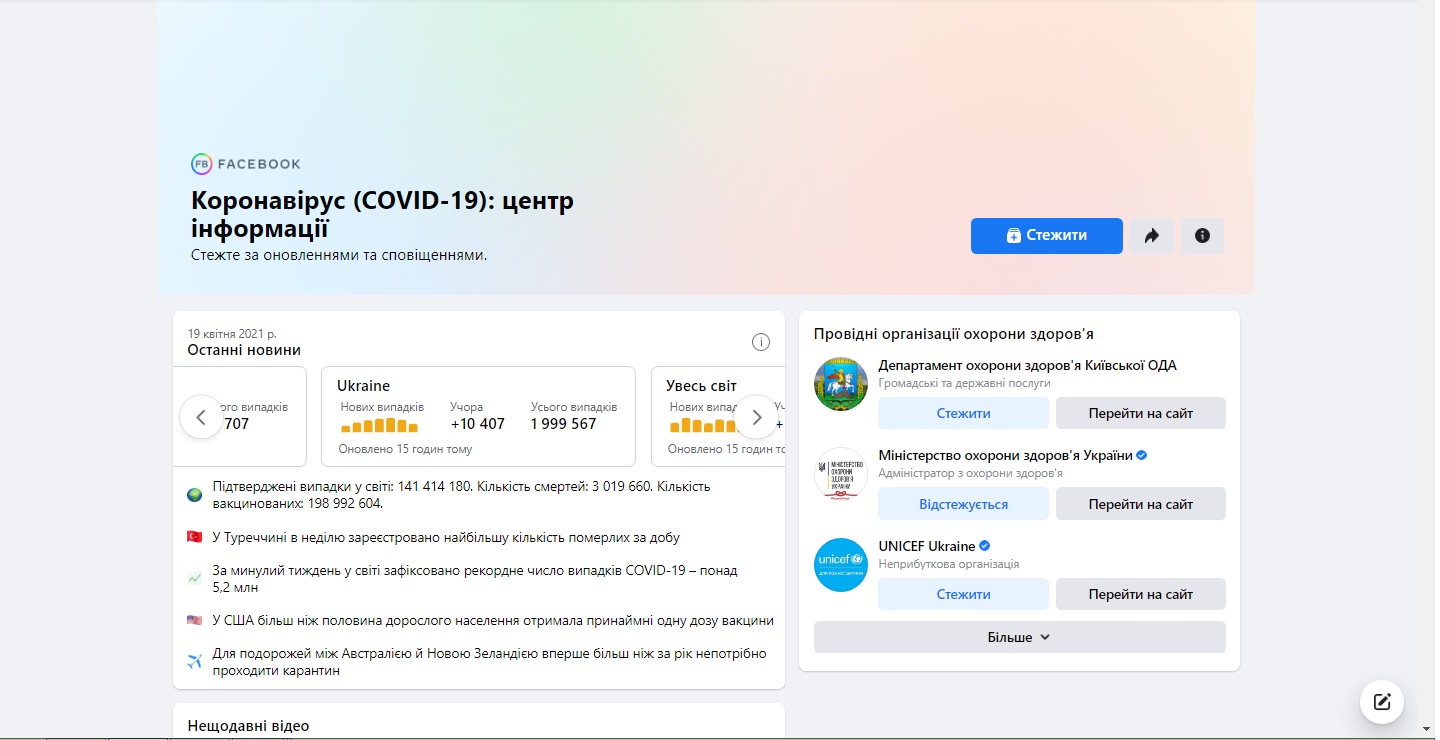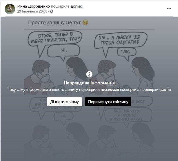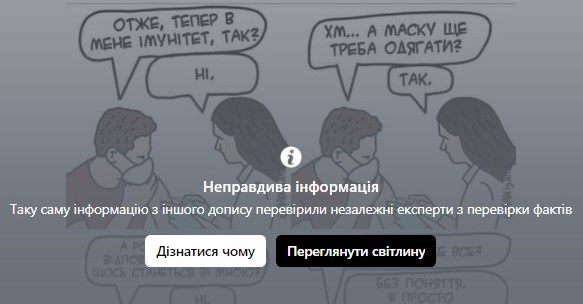 З початком пандемії Covid-19 Facebook розширив перелік тем, що потрапляють під додаткову перевірку, поставивши фейки про Covid-19 в один ряд з такими темами, як пропаганда насильства чи торгівля людьми.