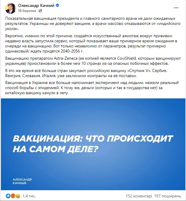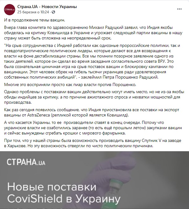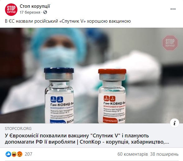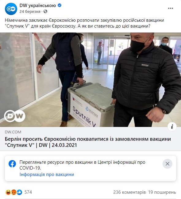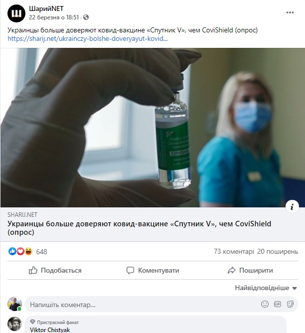 Проте не всі інформаційні повідомлення в українському сегменті Facebook, котрі стосуються щеплень, є відверто негативними. Крім критики та протестів ще присутнє і просування вакцин. Контент на користь Covishield чи Pfizer поширювали державні інституції. Позиція української влади стосовно використання російської вакцини озвучувалась неодноразово. І Президент, і уряд стверджують про те, що вакцина російського виробництва Спутник V закуповуватись не буде, втім окремі проросійські політики та дотичні до них медіа намагаються лобіювати саме цю вакцину. Ними ж поширювався і наратив про те, що Спутник V є ефективнішим, ніж CoviShield.