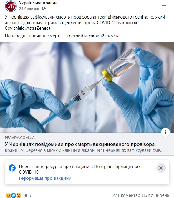 Вже більше року Facebook проводить політику активної боротьби з дезінформацією стосовно пандемії Covid-19. Значна кількість фейків оперативно блокується та видаляється. Все ж залишається проблема з немодерованим контентом, як наприклад, коментарі до дописів, котрі подекуди і є першоджерелом фейків. Кількість поширення фейків та факт зовнішнього втручання у кампанію щеплення в Україні свідчить про те, що окремі сили все ж зацікавлені якщо не в зриві імунізації населення, то принаймні у просуванні своїх інтересів. Адже ці дії явно не потрапляють під ознаки діяльності антиваксинаторів, оскільки для них не характерні витрати значних фінансових ресурсів для боротьби з конкретними брендами. Тому припускаємо, що наразі поширення інформації, котра протидіє вакцинації, носить скоріше політичний або ж комерційний характер.