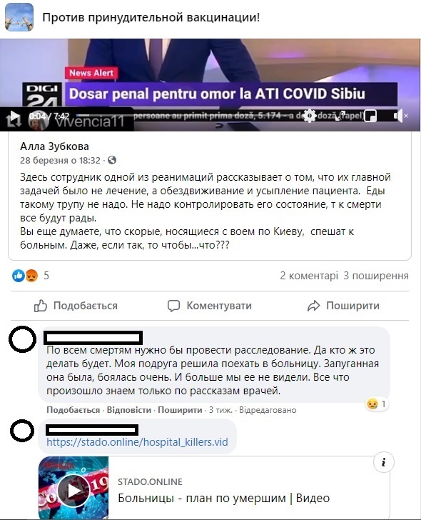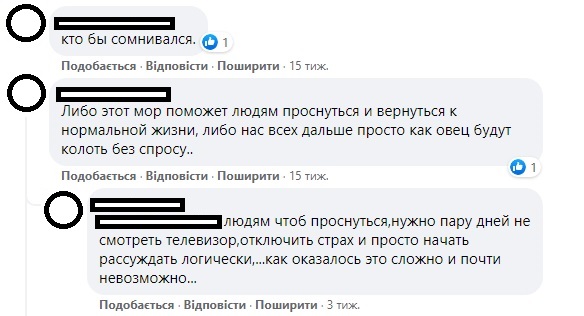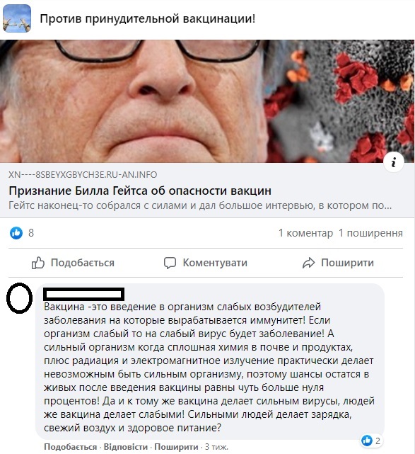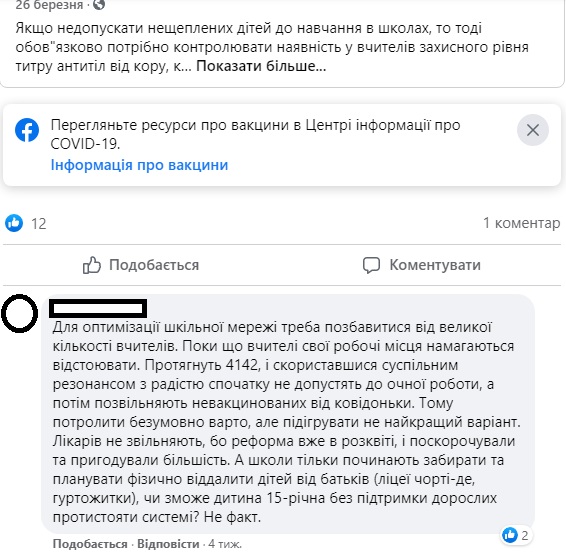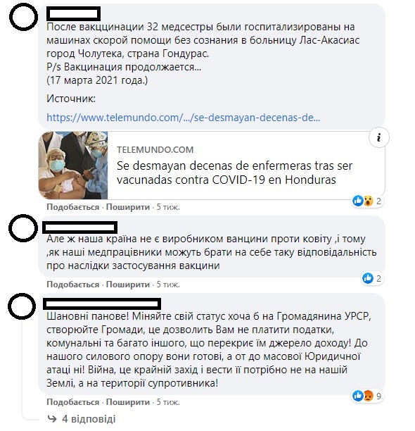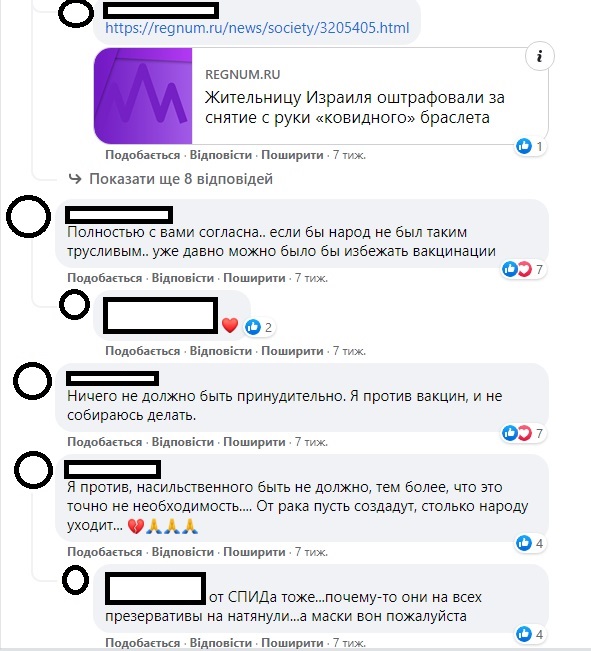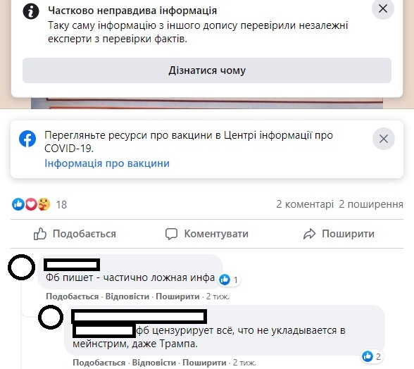 Втім, якщо сторінки та групи у Facebook потрапляють під модерацію і більшість фейків швидко видаляється або належним чином позначається, то питання коментарів, які залишають користувачі, майже ніяк не регулюється. Не залежно від того, чи допис розміщено з підтримкою вакцинації чи проти неї, під ним завжди з’являються коментарі, де обговорюються теорії всесвітньої змови, геноцид людства, чіпування та інші доволі специфічні припущення. Звісно, якщо Ви бачите, що користувач розміщує очевидний фейк, можете поскаржитись на нього. Втім здебільшого це призведе лише до видалення конкретного коментаря. Якщо ж навіть сторінку користувача зрештою заблокують, ніщо не завадить йому зареєструвати нову.