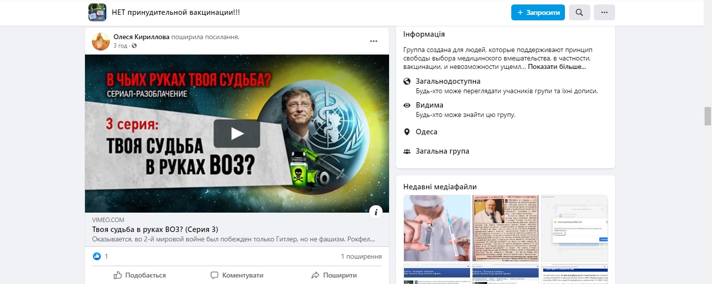 Загалом, знайти групи противників вакцинації у мережі Facebook виявилось не так вже й просто. Крім вищезазначеної групи ГО «Вакцинація вільний вибір» під назвою «НЕТ принудительной вакцинации!!!» вдалось знайти ще кілька: «Прививки. Вакцинация. Реальные истории послепрививочных осложнений», «Против принудительной вакцинации!» та «Ліга: Вакцинація - Вільний Вибір : щеплення – прививки». Слід зазначити, що більшість з них є закритими. Для того, аби приєднатися до спільноти, необхідно заповнити відповідну форму і очікувати схвалення вступу. До речі, при відправці заявки соціальна мережа Facebook наголосить для користувача, що актуальну інформацію про вакцини він може отримати лише на сайті Міністерства охорони здоров’я своєї країни. І лише після цього користувач отримує доступ до контенту, який поширює група. Однак він, здебільшого, потребує окремої перевірки на достовірність. Наприклад, теорії змови про те, що вакцинація є біологічною зброєю, котра створена для планового скорочення населення землі, чи про те, що вакцина проти Covid-19 є не ефективною.