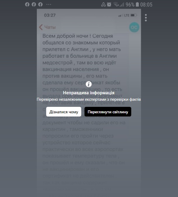 Якщо допис, де згадується коронавірусна інфекція або ж питання вакцинації, викликає велику кількість суперечливих коментарів від користувачів, або на цей допис надходить певна кількість скарг, його перевіркою займаються фактчекингові організації. Вони також можуть перевіряти ту чи іншу інформацію і за власною ініціативою. Якщо фактчекери розпізнають фейк або маніпуляцію, алгоритм Facebook буде діяти так, щоб якомога менше користувачів побачили цю публікацію. Якщо сторінка чи сайт постійно поширює недостовірну інформацію, буде суттєво обмежено її функціонал або й взагалі заблоковано. У випадку, коли допис, який експерти позначили як неправдивий, набув великої кількості поширень, у дію вступають сучасні технології та виявляють всі копії фейку (навіть частково видозмінені). Недостовірний контент належним чином маркується. Якщо користувач поширює недостовірну інформацію, не знаючи про це, після перевірки експертами він отримає відповідне сповіщення, де буде зазначено, що ним розповсюджується фейк.