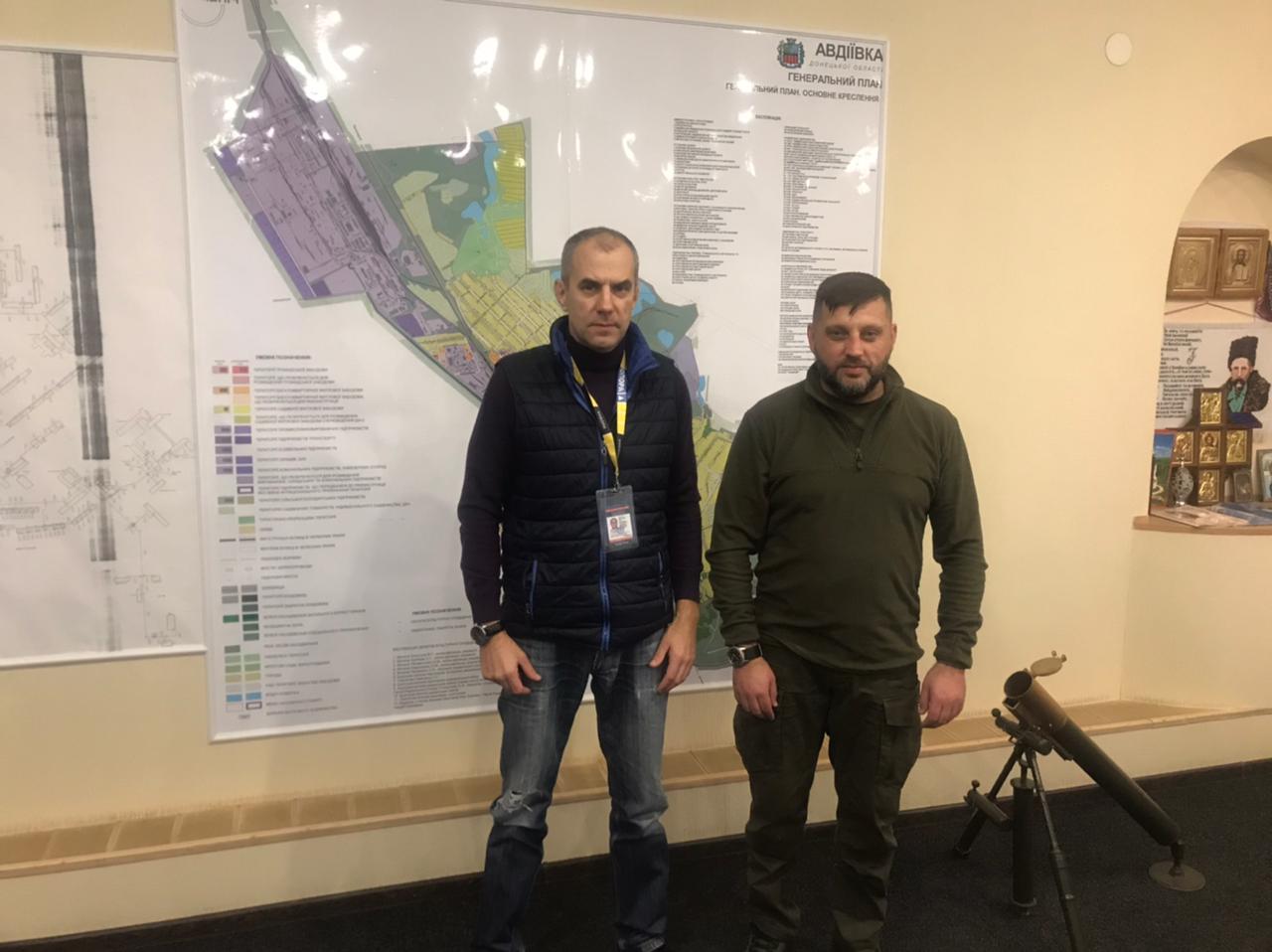 Фото: Безпековий спостерігач ОПОРИ Ігор Денисенко та голова Авдіївської міської ВЦА Віталій Барабаш під час моніторингового візиту в громаду. Джерело фото: Авдіївська міська ВЦА