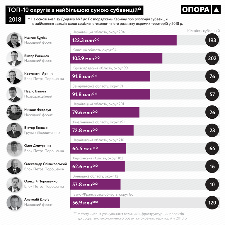 Так, у 2018 році найбільшу кількість субвенцій отримав мажоритарний округ №13 (Вінницька область) Петра Юрчишина – 400. Округ №66 (Житомирська область) Павла Дзюблика одержав 308 субвенцій, а округ №19 Ігоря Гузя – 299. Понад 250 субвенцій також одержали: округ №161 (Сумська область, у ВР представляє Микола Лаврик), округ №198 (Черкаська область, у ВР представляє Сергій Рудик), округ №65 (Житомирська область, у ВР представляє Володимир Литвин) та округ №92 (Київська область, у ВР представляє Віталій Гудзенко).