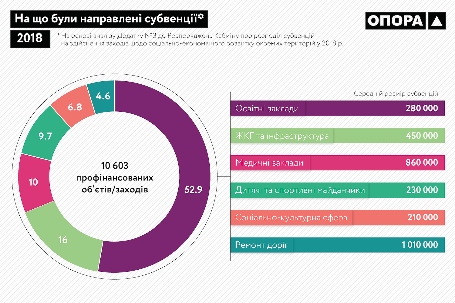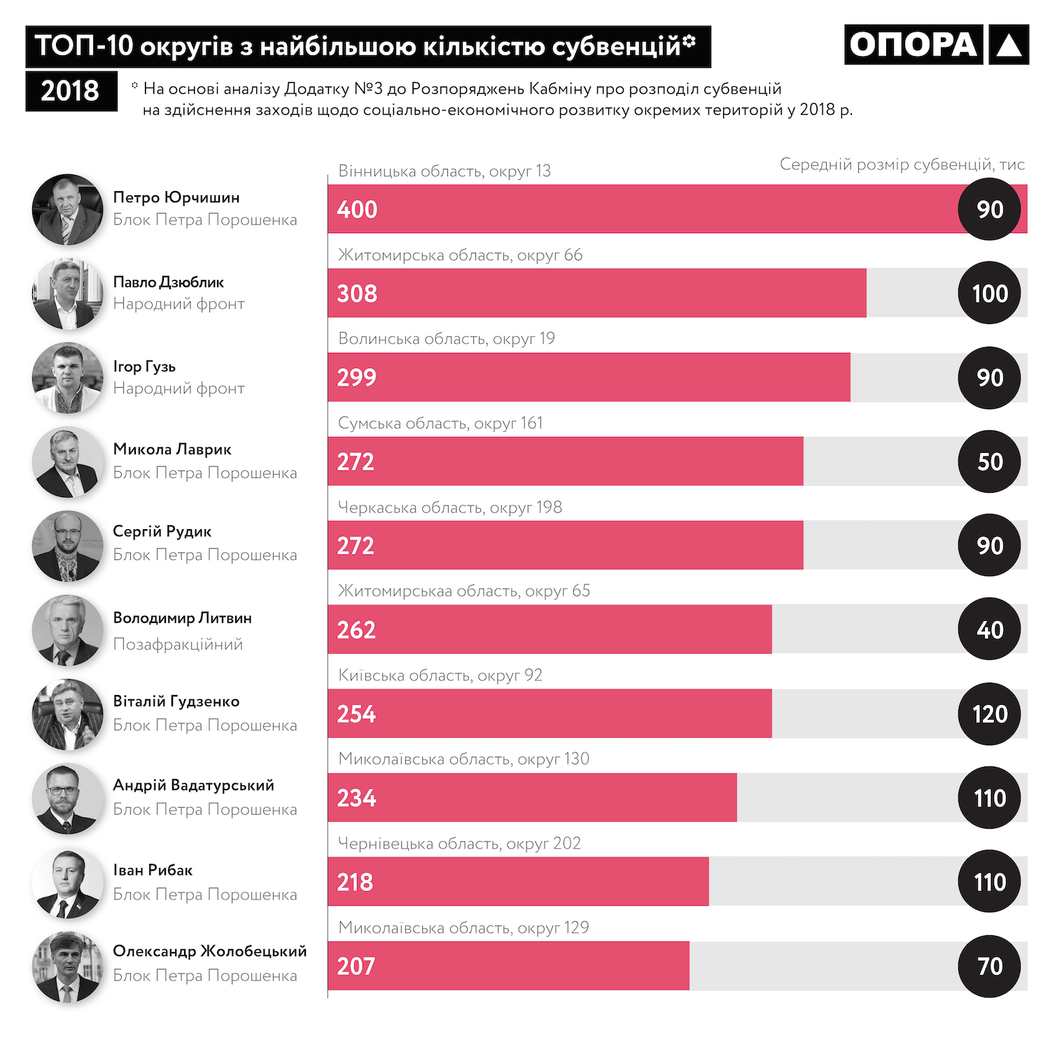 У період з червня 2018 року по січень 2019 року ОПОРА зафіксувала більше 1506 випадків використання бюджетних ресурсів у цілях непрямої агітації на користь нардепів та парламентських партій. Такі електоральні маніпуляції, які розпочалися задовго до офіційного старту загальнонаціональних виборів 2019 року, можуть бути загрозою забезпеченню всім кандидатам рівних прав та можливостей уже під час виборчої кампанії. Тому ОПОРА проаналізувала, як відбувається процес розподілу субвенцій між округами депутатів, що входять до різних депутатських фракцій та груп в українському парламенті.