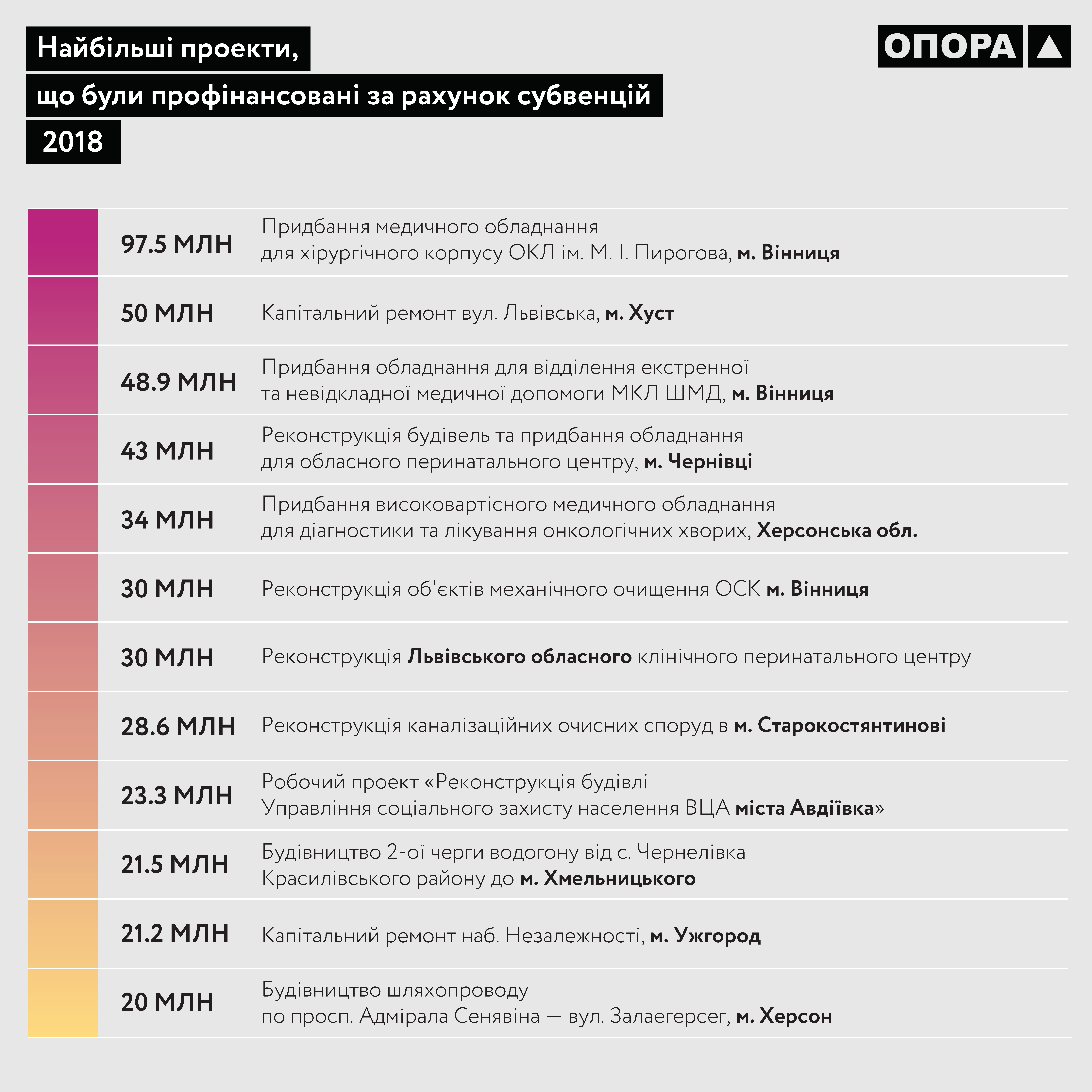 Так, у м. Вінниці на придбання медичного обладнання для хірургічного корпусу ОКЛ ім. М. І. Пирогова було направлено 97,5 млн грн, а на реконструкцію об'єктів механічного очищення ОСК м. Вінниця – 30 млн грн. У той же час для потреб ДНЗ "Веселка", що у селі Кордишівка Вінницької області, було закуплено промислову м’ясорубку вартістю лише 4 тисячі гривень. І це не єдиний випадок. Адже до Вінницької області було направлено ще 140 субвенцій, кожна з яких вартістю менше 10 тисяч гривень.
