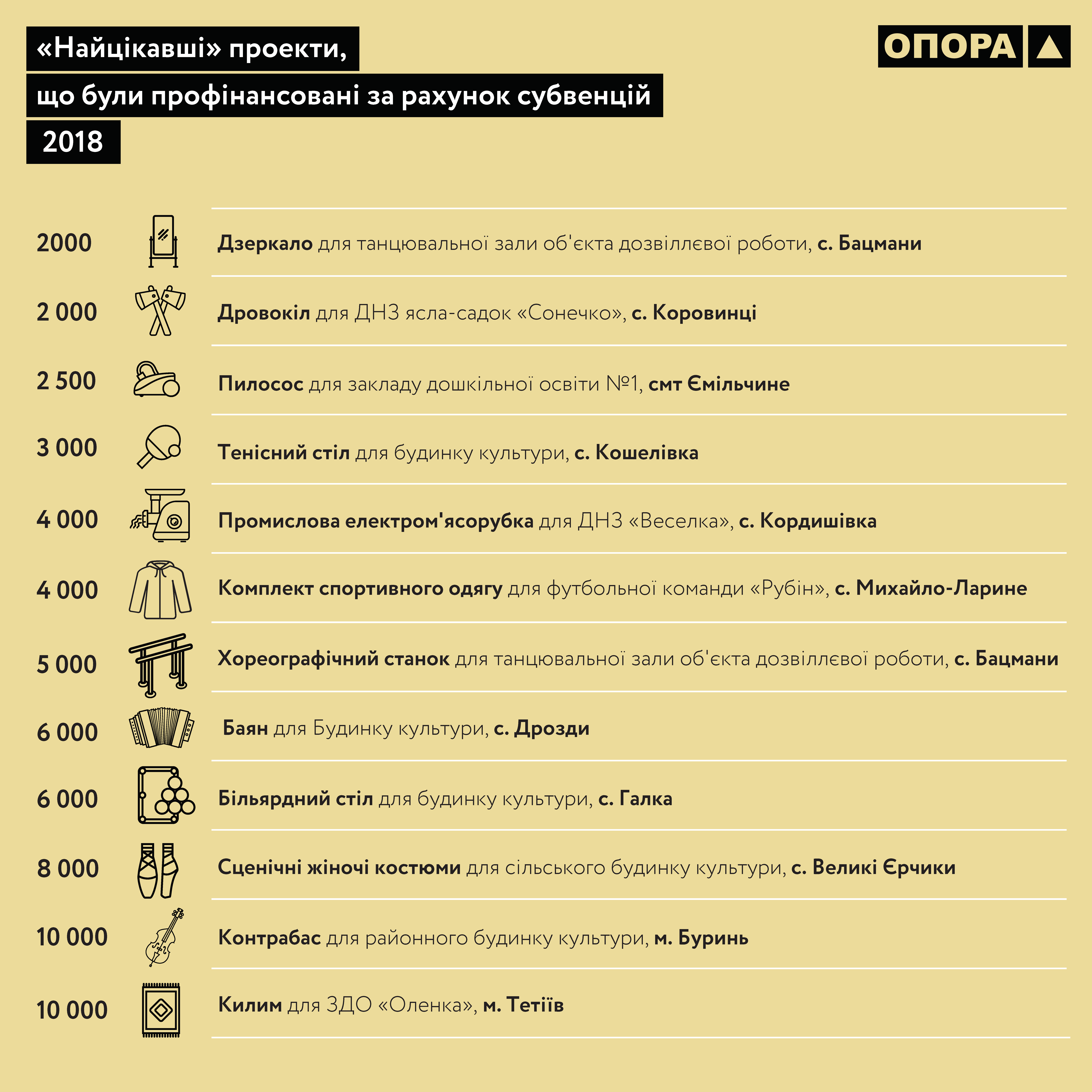 Наведемо інші приклади. Для ремонту кількох вулиць у місті Шостка Сумської області було виділено 10 млн грн. Натомість багато інших субвенцій, що були направлені до області, викликають серйозні запитання з приводу ефективності та сталості розвитку регіону. Так, до села Бацмани було направлено 2 000 гривень для придбання дзеркала для танцювальної зали та ще 5 000 гривень – хореографічного станка; для будинку культури села Галки було виділено 6 000 гривень для купівлі більярдного столу, а для м. Буринь – 10 000 гривень для придбання контрабаса.
