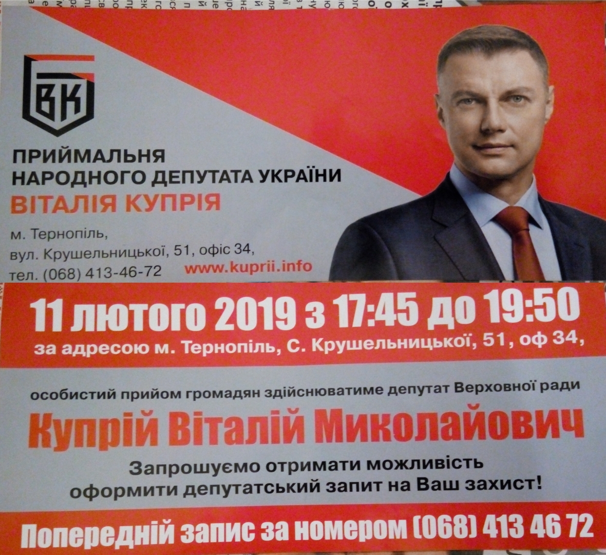 Цього ж дня, 11 лютого, у Тернополі перебував кандидат у президенти Віталій Купрій. Напередодні серед населення розповсюджувалися листівки з повідомленням про його візит та можливість під час зустрічі оформити депутатський запит. У тексті анонсу зазначалося, що особистий прийом громадян здійснюватиме депутат Верховної ради.