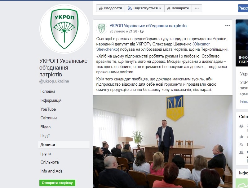 20 лютого Олександр Шевченко відвідав декілька населених пунктів Тернопільської області. Усі заходи проходили у форматі зустрічей із трудовими колективами. Так, кандидат зустрівся із працівниками пекарні міста Чорткова, із медиками районної лікарні у місті Копичинці, а також із працівниками заводу електротехніки «Інтеграл» у місті Тернополі. Інформація про візит була опублікована на офіційній сторінці УКРОП Українське об'єднання патріотів в мережі Facebook. Шевченко у своїх виступах акцентував, що країна потребує нових політиків при владі.