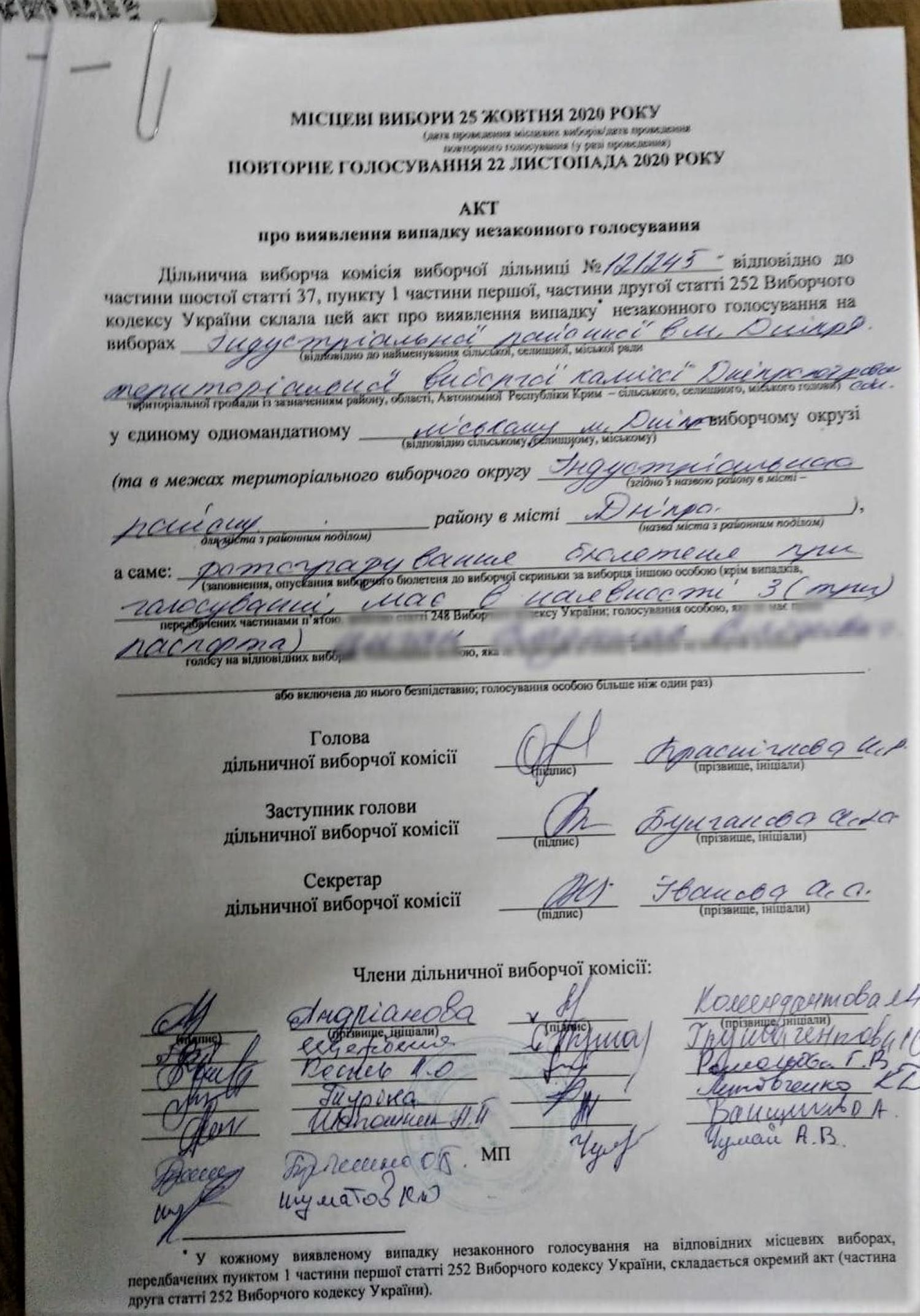 На виборчій дільниці №121276 (пр. П. Калнишевського, 27, Палац Металургів) чоловік сфотографував бюлетень. Коли члени комісії зробили йому зауваження, дівчина, що була разом ним, розірвала бюлетень. Шматки бюлетеня вона викинула, а чоловік втік.