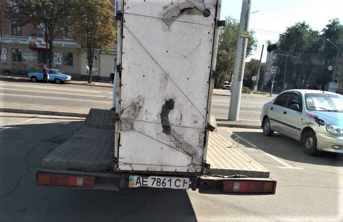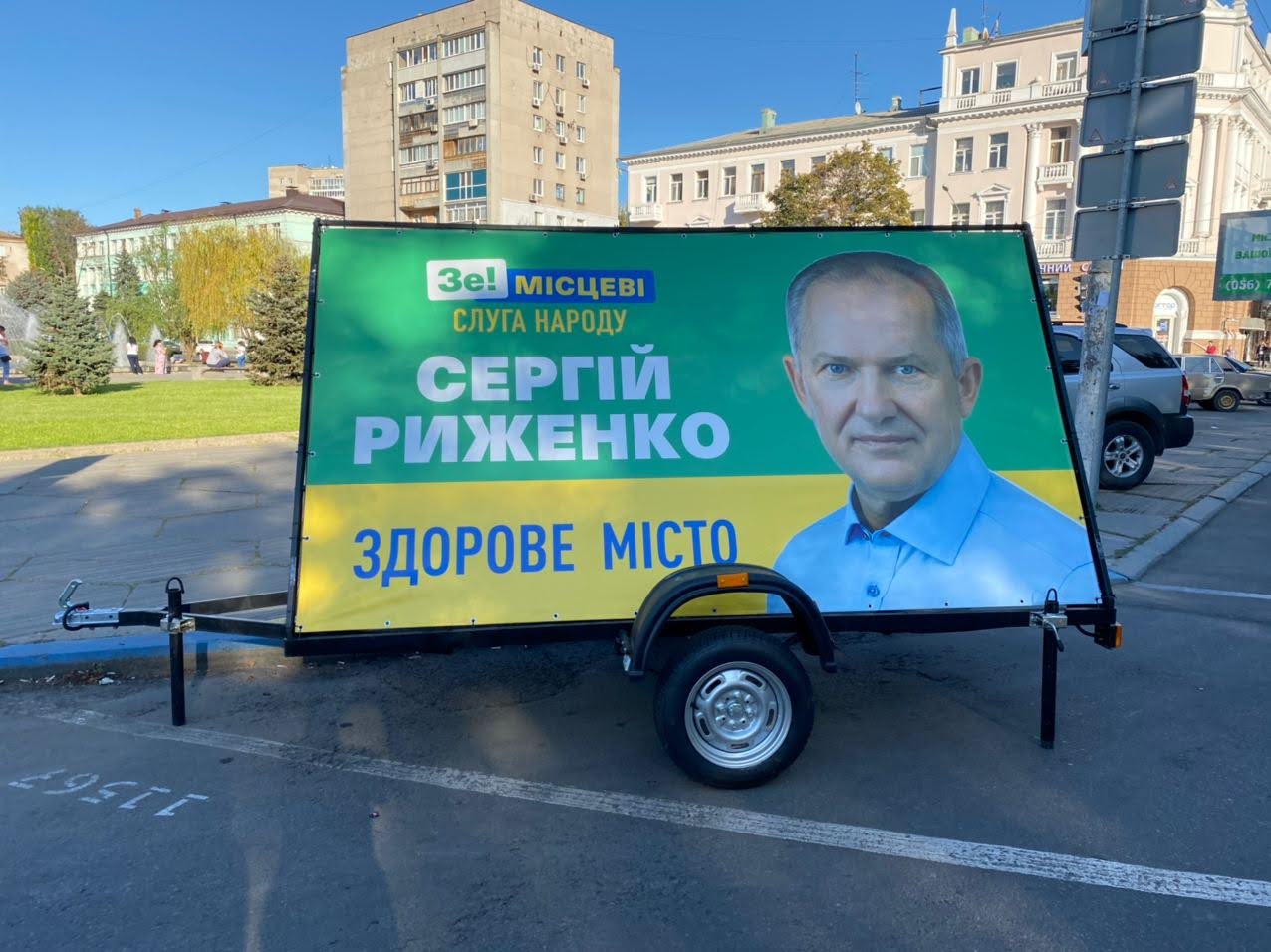 На проспекті Яворницького зафіксовані автомобільні причепи з рекламою партії «Слуга народу» та на той момент потенційним кандидатом на посаду міського голови Сергієм Риженком.