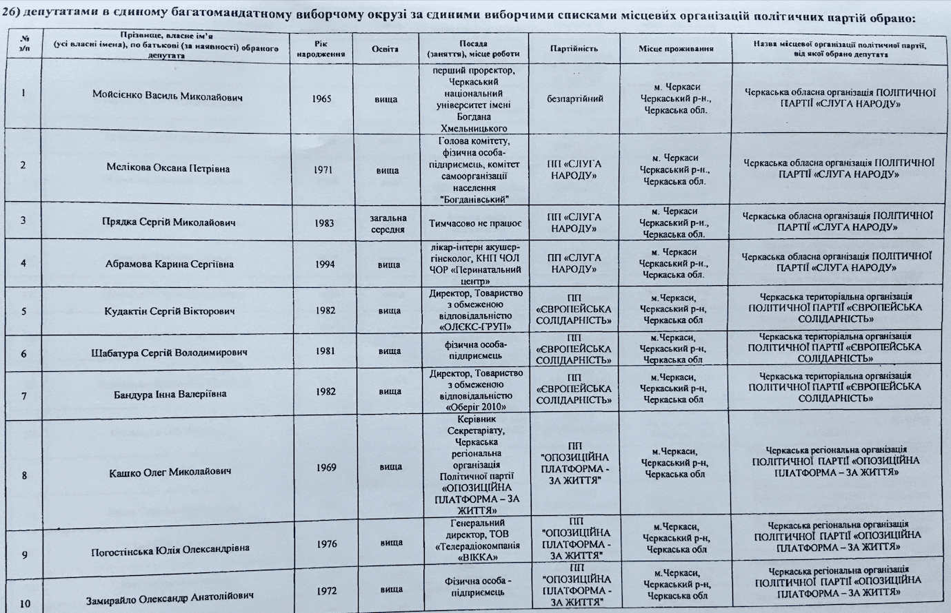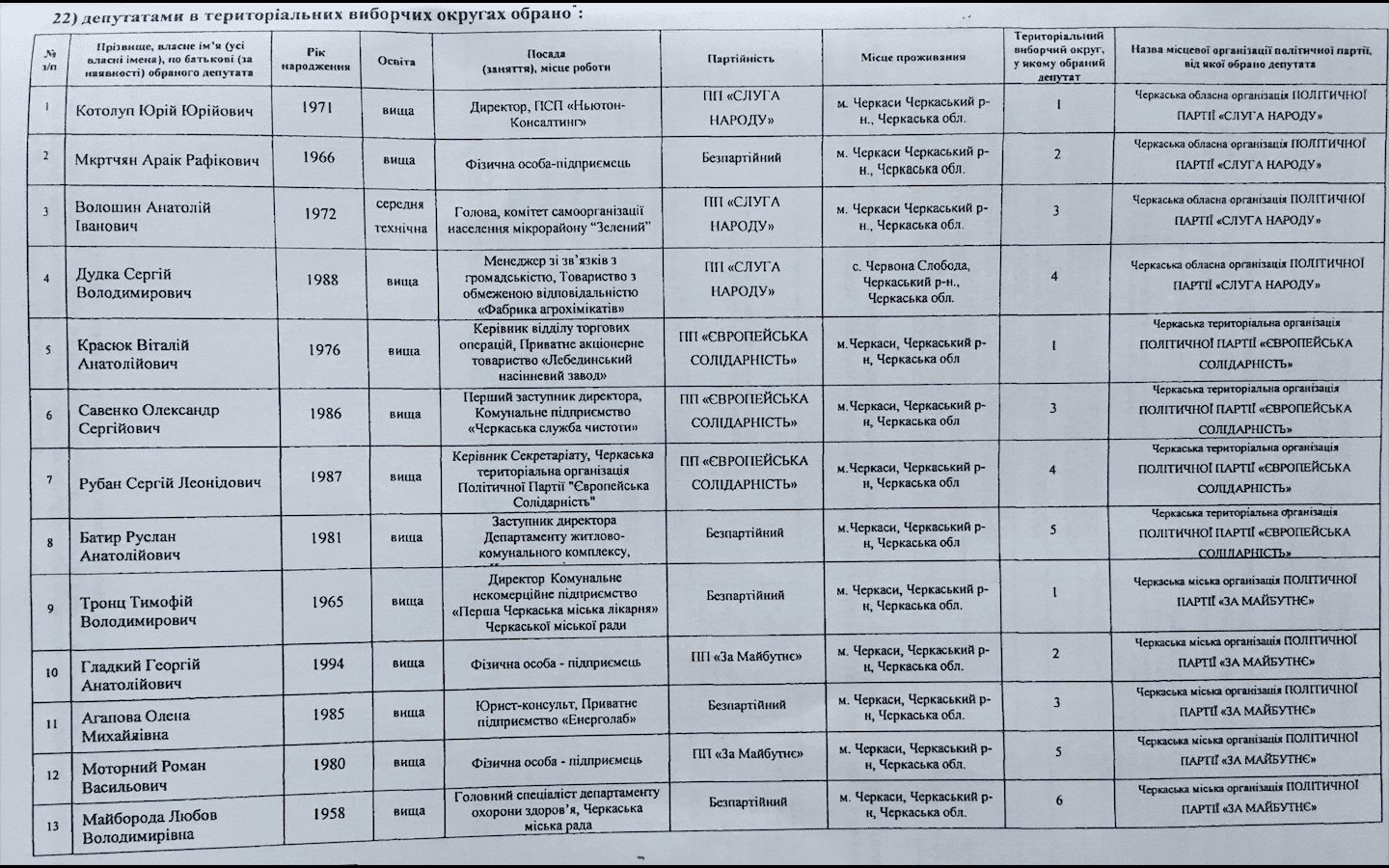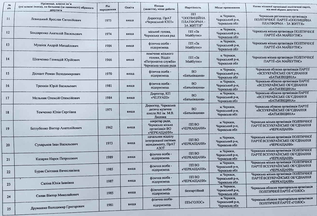 На 42 депутатські мандати черкаської міської ради претендували 737 кандидатів. Згідно з результатами виборів, між партіями їх розподілили наступним чином: партія “Слуга Народу” отримала 8 мандатів, “Європейська солідарність” – 7, “Опозиційна платформа – За життя” – 3, “За майбутнє” – 8, ВО “Батьківщина” – 4, ВО “Черкащани” – 5, “Голос” – 6.