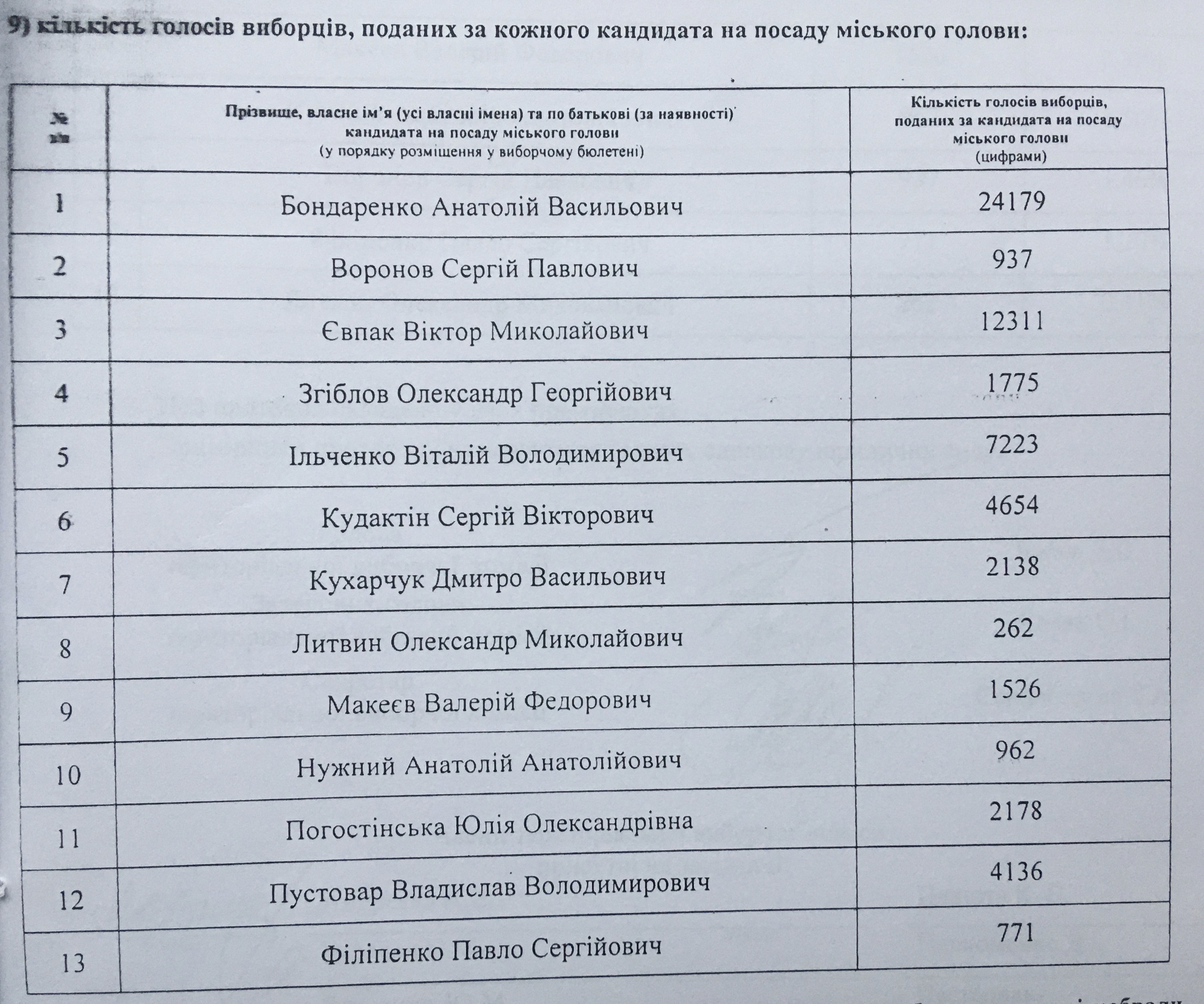 У голосуванні з виборів Черкаського міського голови взяли участь 64 312 виборців. 1 260 бюлетенів визнано недійсними. Найбільшу кількість голосів набрали чинний міський голова, представник партії “За майбутнє” Анатолій Бондаренко (24179 — 37,6%) та кандидат від партії “Голос”, IT-підприємець Віктор Євпак (12 311 – 19,14%).