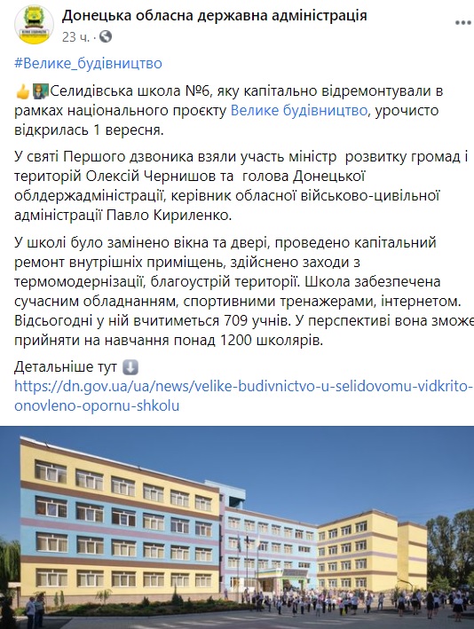 Першого вересня делегація Донецької обласної військово-цивільної адміністрації відвідала урочисті заходи в окремих школах Донеччини. Зокрема, у місті Селидове відбулося урочисте відкриття школи №6 після реконструкції. У святі Першого дзвоника взяли участь Міністр розвитку громад і територій Олексій Чернишов та голова Донецької облдержадміністрації, керівник обласної військово-цивільної адміністрації Павло Кириленко, про що було повідомлено на офіційному сайті та опубліковано на сторінці Павла Кириленка у Facebook.