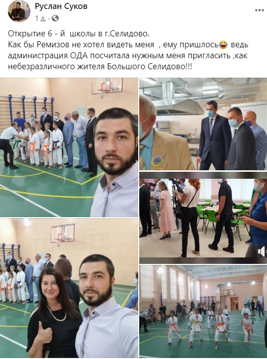 На світлинах з урочистого заходу представники ОПОРИ помітили, що у складі делегації був присутній депутат Покровської міської ради Руслан Суков, який на своїй сторінці у соціальній мережі також опублікував фотозвіт. Руслан Суков у пості від 1 вересня 2020 року написав про те, що адміністрація ОДА врахувала за потрібне запросити на цей захід саме його як небайдужого мешканця Великого Селидового. До того ж, на розміщених світлинах із заходу фотографіях видно, що Руслан Суков, зайшовши у клас до дітей, знаходився у приміщенні без медичної маски, що порушує режим карантину та рекомендації Міністерства освіти і науки України.