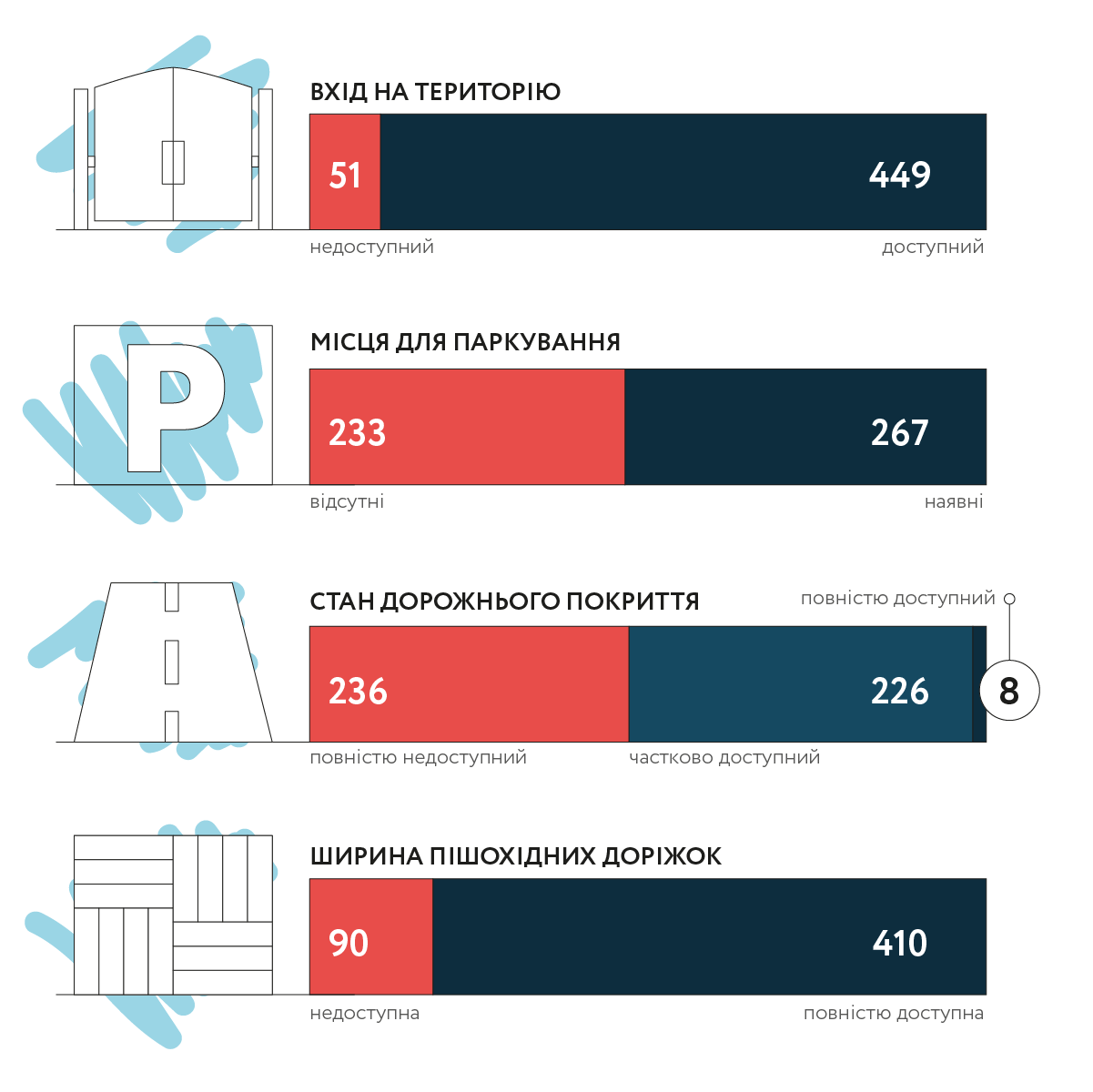 Попри позитивну оцінку щодо наявності місць для паркування для осіб з інвалідністю, слід відзначити, що стоянок, які спеціально виділені для даних категорій осіб, дуже мала кількість. Для оцінювання наявності пристосованих стоянок для осіб з інвалідністю бралась фактична наявність загальних стоянок автотранспортних засобів та можливість безперешкодно потрапити зі стоянки до входу в будівлю.