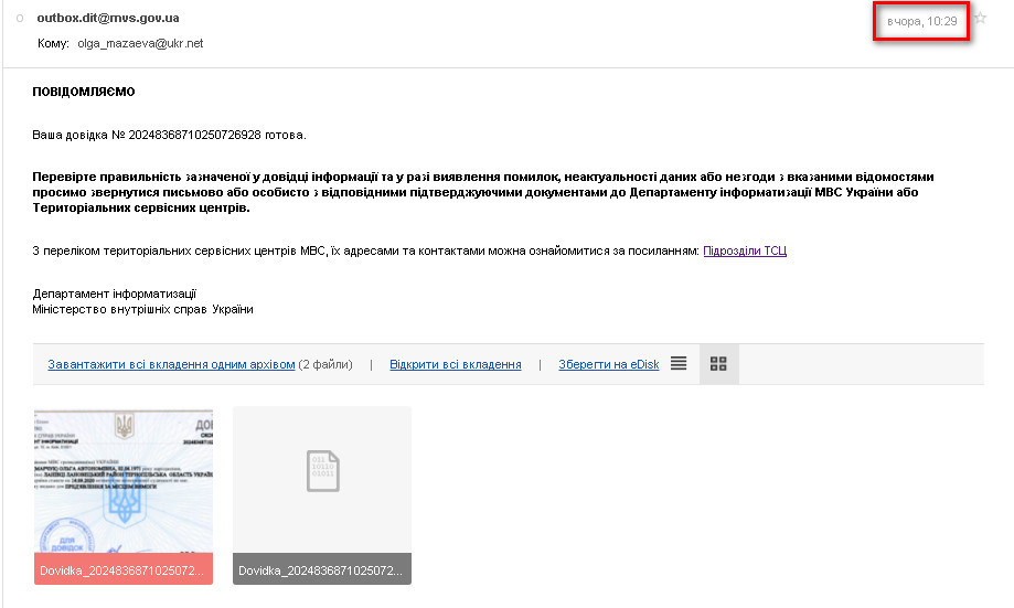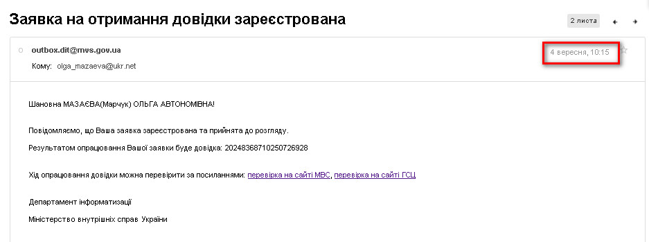 Проте, мої сподівання не виправдались. Довідку в електронній формі, підписану електронним цифровим підписом я отримала лише 14 вересня, тобто через 10 днів.
