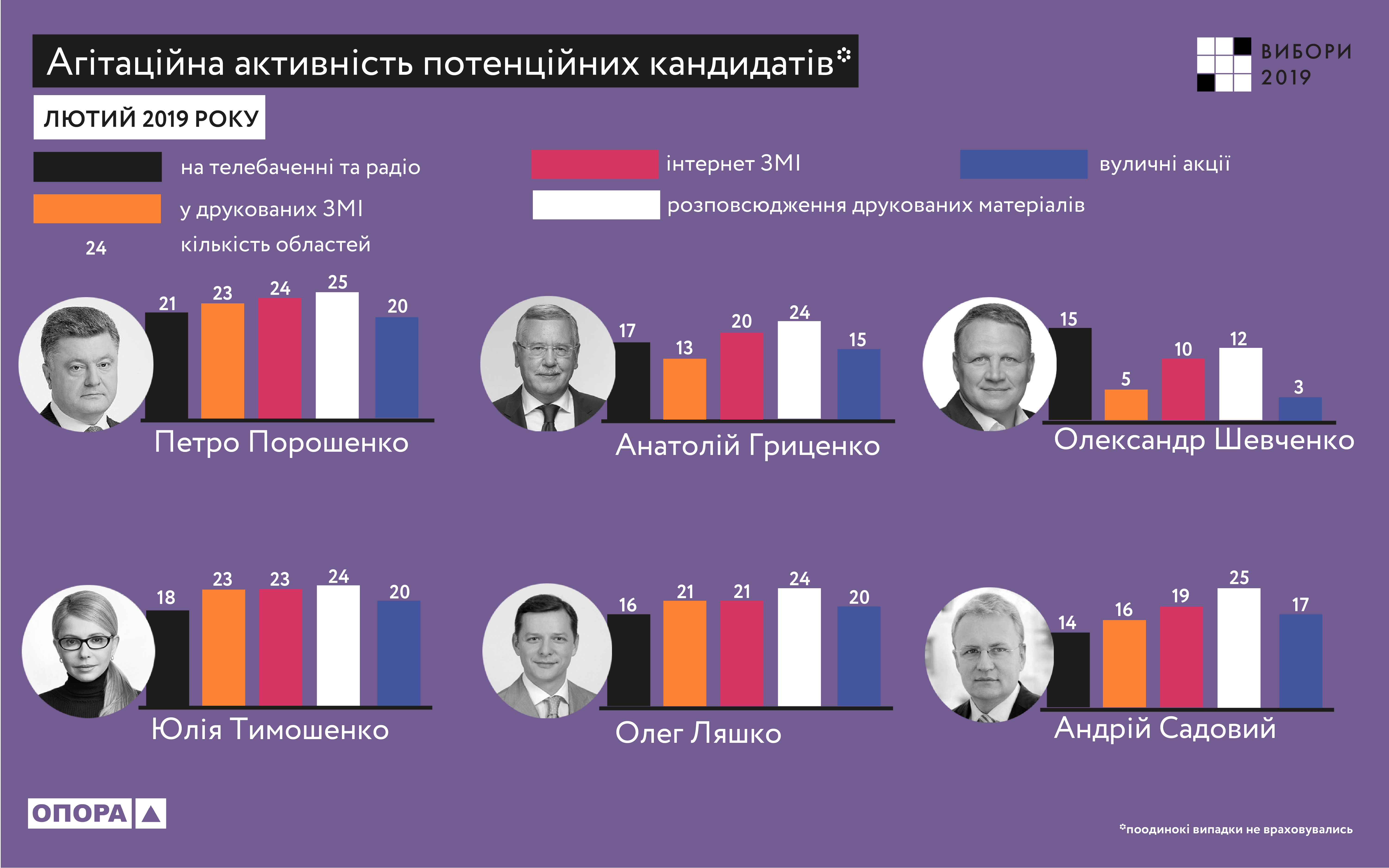 Як і у січні 2019 року, спостерігачі ОПОРИ звернули увагу на наявність ознак прихованої передвиборної агітації на концертах продюсерського центру “Ліга сміху”, засновником якого є кандидат на пост Президента України Володимир Зеленський. Під час проведення таких концертів у регіонах України транслюється відеозвернення Володимира Зеленського, яке має ознаки передвиборної агітації. Відповідно до чинного законодавства України кандидат на пост Президента України має право підтримувати проведення концертів, що є легальною формою агітації. Такі агітаційні заходи повинні бути профінансовані з виборчого фонду кандидата. Володимир Зеленський зобов’язаний у разі проведення агітації у межах концертів “Ліги сміху” фінансувати їх з виборчого фонду або уникати будь-яких проявів передвиборної агітації під час проведення цих розважальних заходів. ОПОРА закликає кандидата чітко розмежовувати свою професійну і політичну діяльність, дотримуючись вимог законодавства щодо фінансування передвиборної агітації з виборчого фонду.