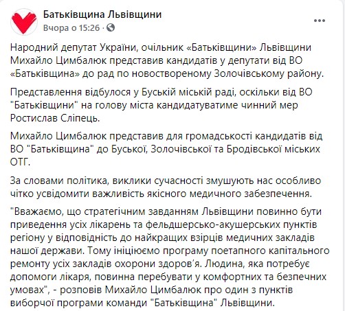 Про те, що народний депутат України, очільник «Батьківщини» Львівщини Михайло Цимбалюк представив кандидатів у депутати від ВО «Батьківщина» до рад у новоствореному Золочівському районі, можна дізнатися із повідомлення, опублікованого 26 вересня на сторінці «Батьківщина Львівщини» у соціальній мережі Facebook.