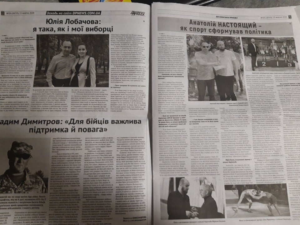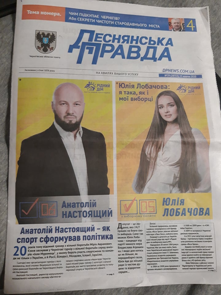 В газеті «Деснянська Правда» (№39 від 15 жовтня 2020 року) містяться матеріали «Анатолій Настоящий – як спорт сформував політика» та «Юлія Лобачова: я така, як і виборці» на першій, другій та третій шпальтах. На фото видно логотип партії «Рідний Дім» та на фото розворотів з кандидатами присутній голова партії – нинішній міський голова Чернігова – Владислав Атрошенко.