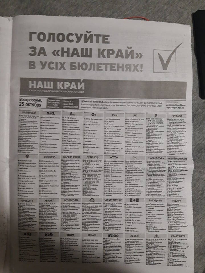 Політична реклама та заклики голосувати за партію «Наш Край» без відповідних маркувань помічені в газеті «Деснянка» (№41 від 15 жовтня 2020 року): «Голосуйте за Наш Край в усіх бюлетенях!» з логотипом та слогану партії «Наш Край».