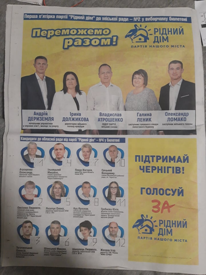 Газета « Деснянська правда» (№39 від 15 жовтня 2020 року) опублікувала сторінку з політичною рекламою партії «Рідний Дім», яка містить лого, слогани партії, фото представників та лідера партії» «Перша п’ятірка партії Рідний Дім до міської ради – №2 в виборчому бюлетені», «Підтримай Чернігів. Голосуй ЗА Рідний Дім. Партія нашого міста».