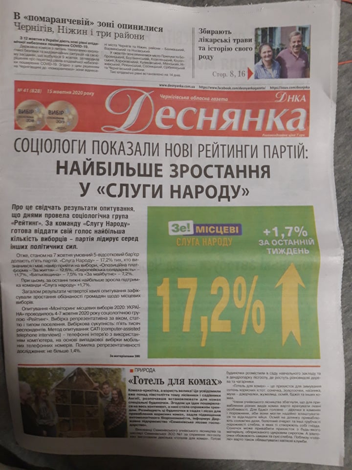В газеті «Деснянка» (№41 від 15 жовтня 2020 року) опублікований матеріал в підтримку партії «Слуга Народу»: «Соціологи показали нові рейтинги партій: найбільше зростання у «Слуги Народу» й містить логотип політичної сили «Зе! Місцеві. Слуга Народу!». Публікація містить інформацію про опитування соціологічної групи «Рейтинг» та нібито лідирування партії порівняно з іншими.
