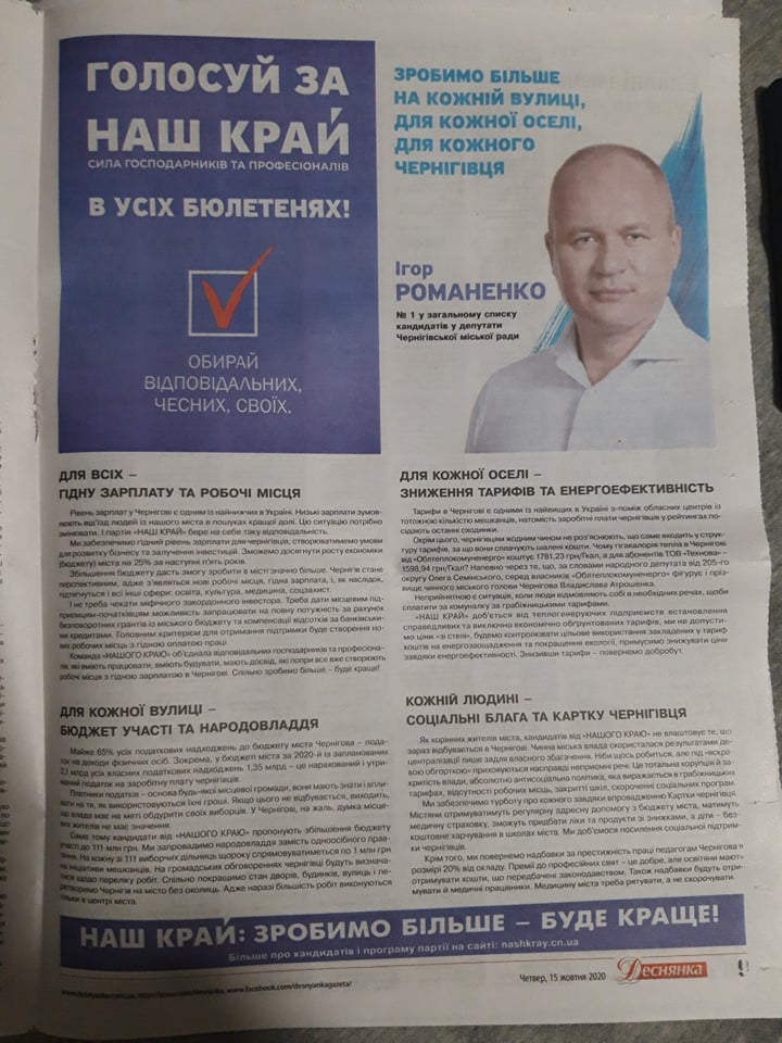 Той самий випуск газети «Деснянка» на 9 шпальті містить політичну рекламу на підтримку партії «Наш Край» та кандидата від партії Ігоря Романенко: «Голосуй за Наш Край. Сила Господарників та професіоналів. В усіх бюлетенях! Обирай відповідальних, чесних, своїх», «Зробимо більше на кожній вулиці, для кожної оселі, для кожного чернігівця. Ігор Романенко – №1 в загальному списку кандидатів у депутати Чернігівської міської ради».