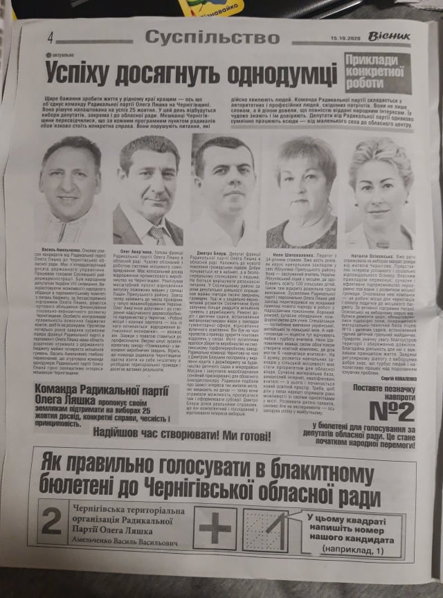 Обласна газета «Чернігівський Вісник» (№42 від 15 жовтня 2020 року) опублікувала інформацію, щодо правильного заповнення бюлетеня, куди додала політичну рекламу Чернігівської територіальної організації Радикальної партії. Разом з цим на 4 шпальті міститься матеріал «Успіху достягнуть однодумці. Приклади конкретної роботи», де розміщена інформація про діяльність деяких із кандидатів партії та заклики підтримати партію на виборах: «Команда Радикальної партії Олега Ляшка пропонує своїм землякам підтримати на виборах 25 жовтня досвід, конкретні справи, чесніть і принциповість», «Надійшов час створювати. Ми готові!».