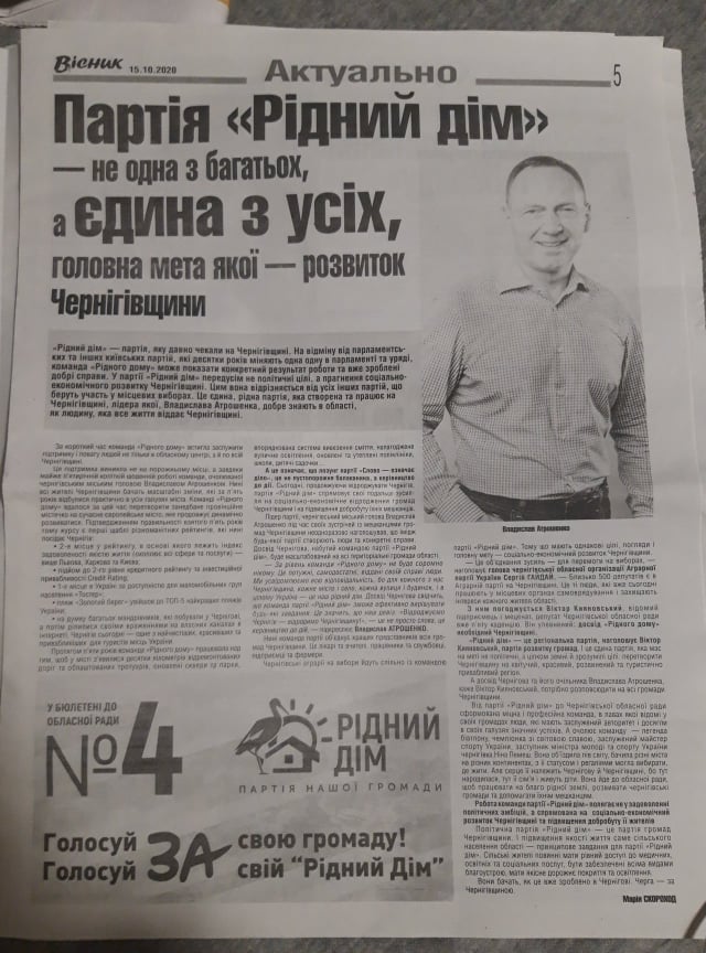 На 5 сторінці того ж випуску газети «Вісник» в розділі «Актуально» опублікований матеріал на підтримку партії «Рідний Дім», з логотипом партії, фото лідера партії Чернігівським міським головою – Владислав Атрошенко та його коментарями. Матеріал «Партія «Рідний Дім» не одна з багатьох, а єдина, з усіх, головна мета якої – розвиток Чернігівщини» містить заклики підтримати парті «Голосуй За свою громаду. Голосуй За свій Рідний Дім!».